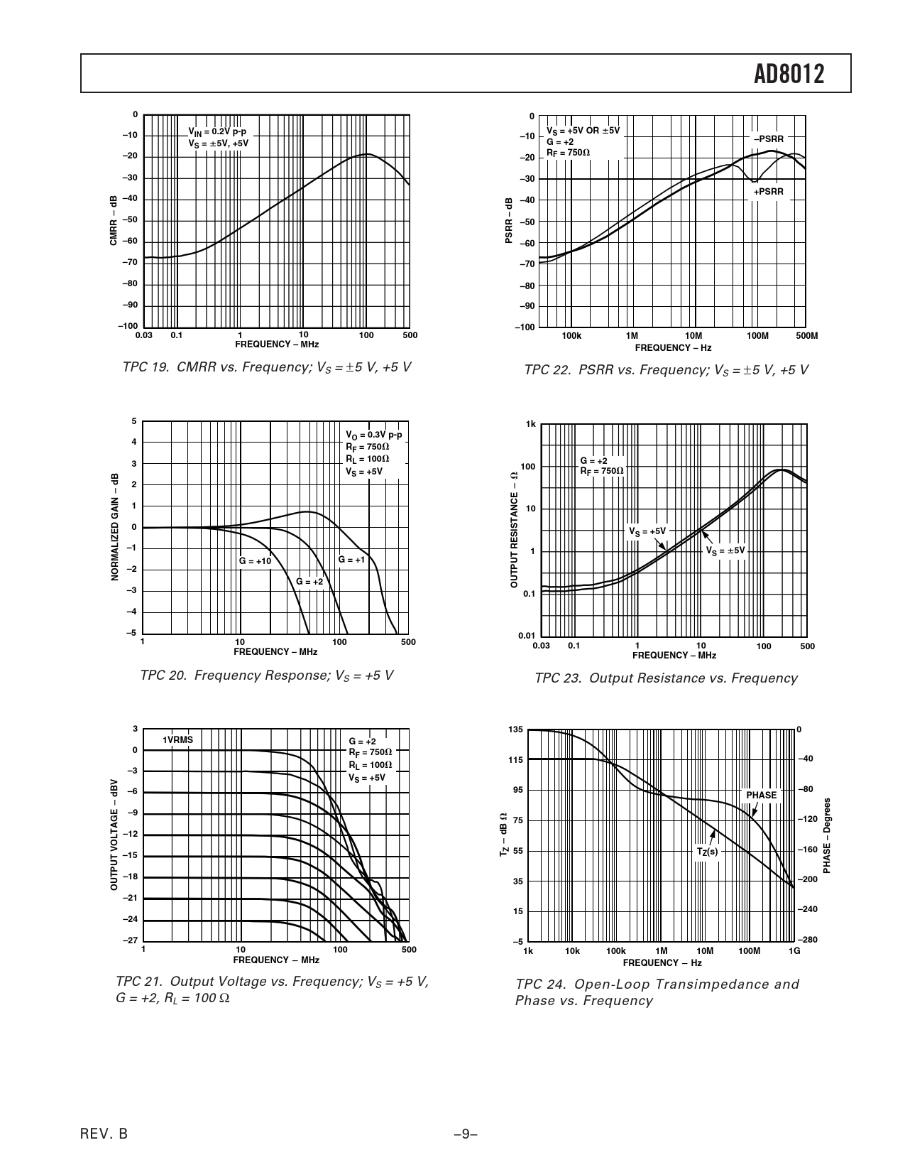 AD8012. –10. IN = 0.2V p-p. S = +5V OR. –PSRR. G = +2. S =. 5V, +5V. –20. F = 750. –30. +PSRR. –40. –50. –60. CMRR. PSRR – dB –60. –70. –80. –90. –100. 0.03. 0.1