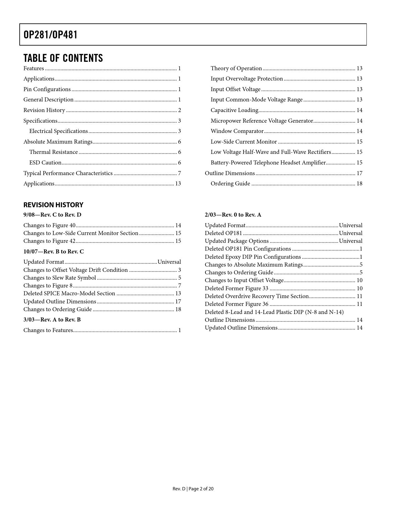 Pages / Page20 / 2 — OP281/OP481. TABLE OF CONTENTS. REVISION HISTORY. 9/08—Rev. C to Rev. D. …