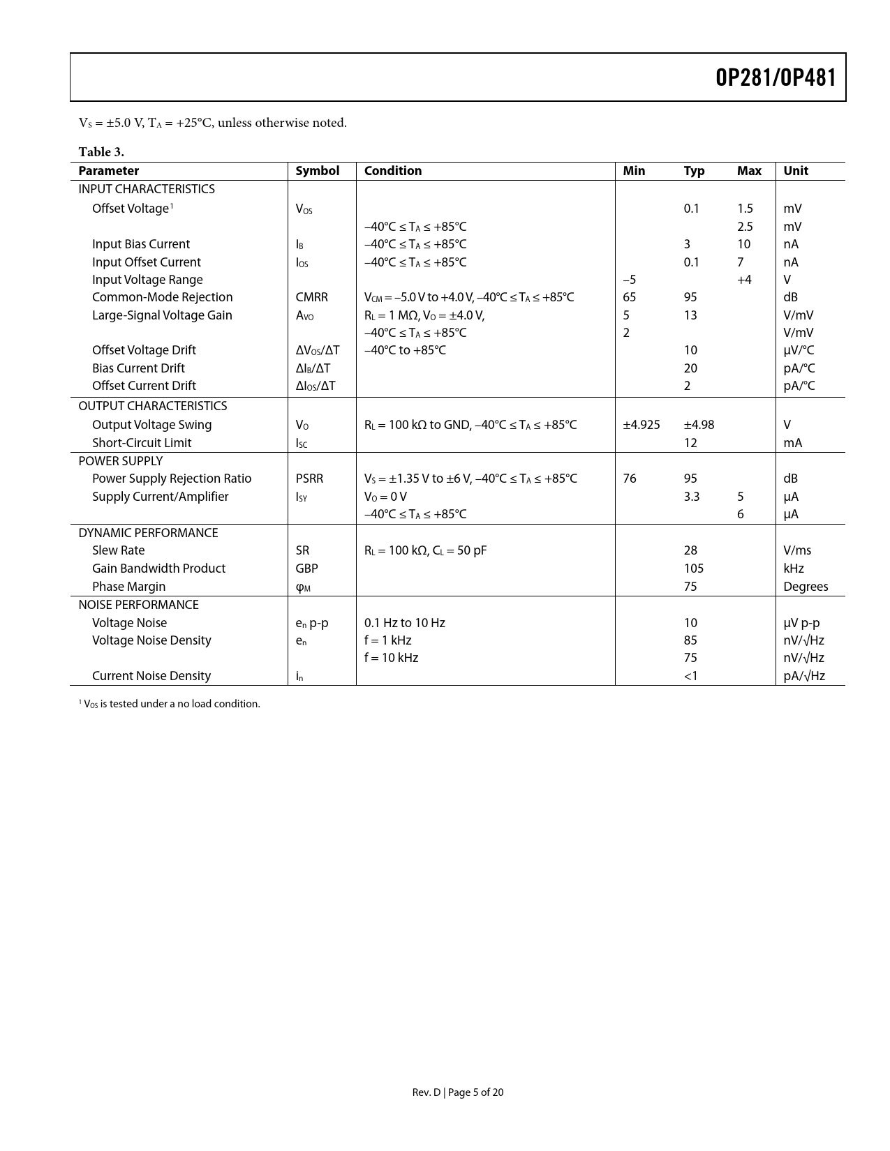 OP281/OP481 Table 3 Parameter Symbol Condition Min Typ Max Unit