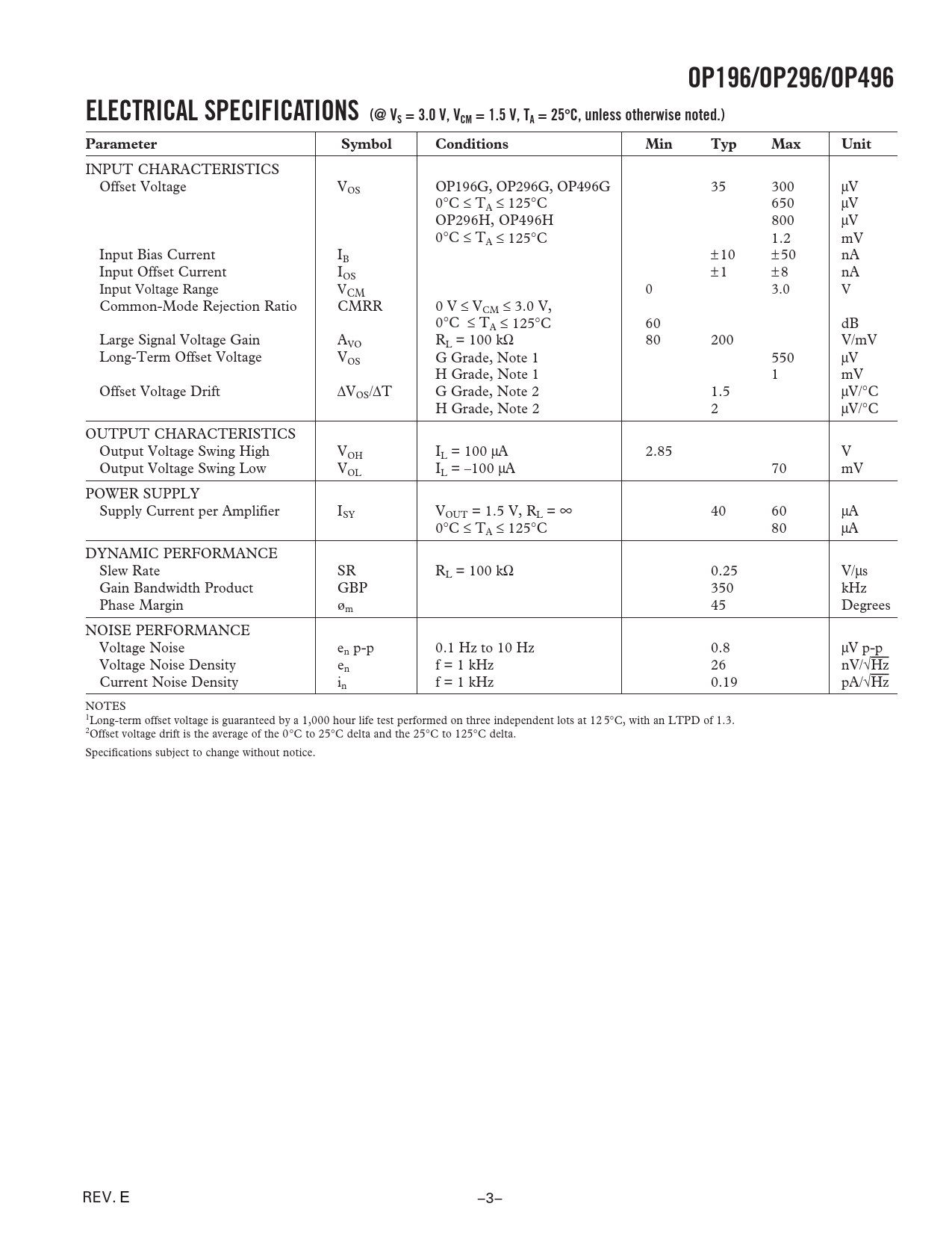 OP196/OP296/OP496 ELECTRICAL SPECIFICATIONS (@ VS = 3.0 V, VCM = 1.5 V, TA = 25
