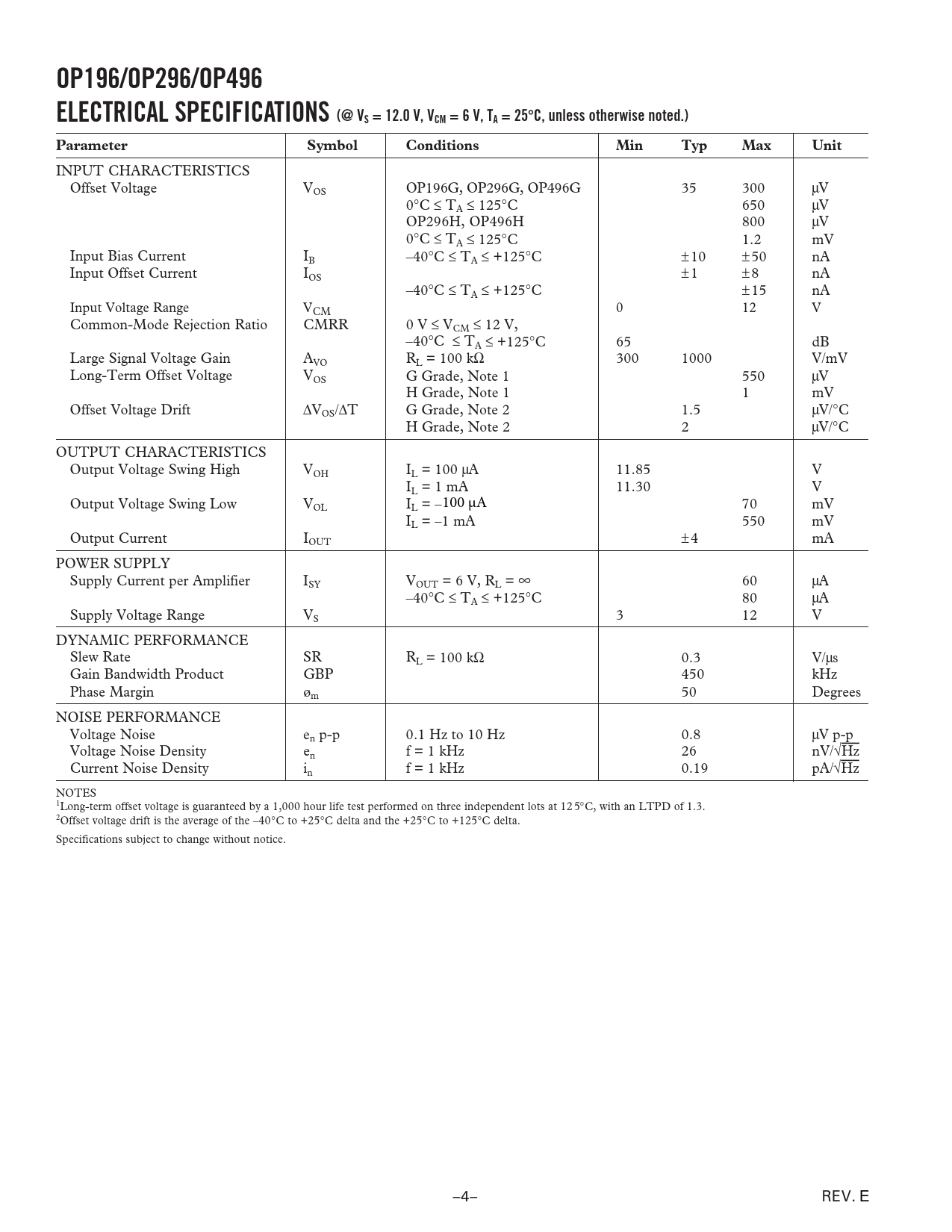 OP196/OP296/OP496 ELECTRICAL SPECIFICATIONS (@ VS = 12.0 V, VCM = 6 V, TA = 25 C, unless otherwise noted.) Parameter