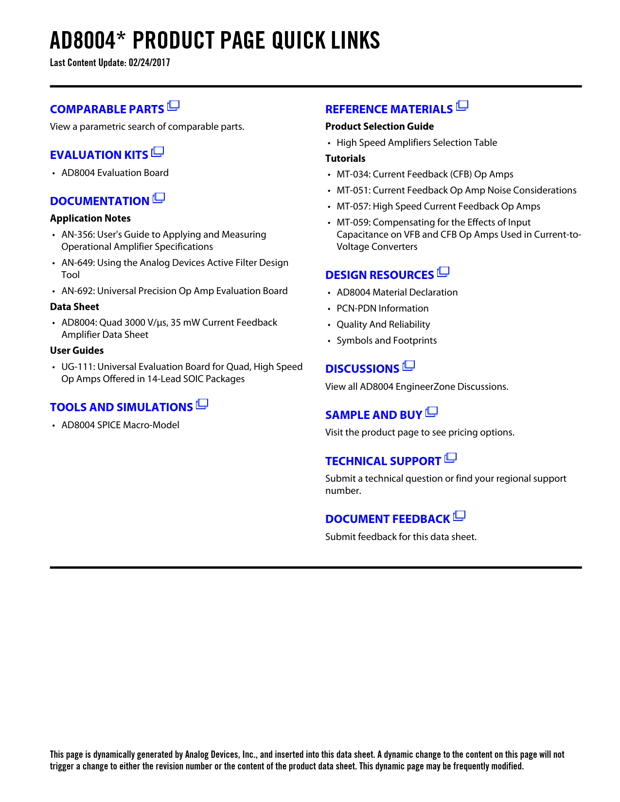 AD8004* PRODUCT PAGE QUICK LINKS Last Content Update: 02/24/2017COMPARABLE PARTSREFERENCE MATERIALS View a parametric search of comparable parts. Product Selection Guide • High Speed Amplifiers Selection Table EVALUATION KITSTutorials • AD8004 Evaluation Board • MT-034: Current Feedback (CFB) Op Amps • MT-051: Current Feedback Op Amp Noise Considerations DOCUMENTATION • MT-057: High Speed Current Feedback Op Amps Application Notes • MT-059: Compensating for the Effects of Input • AN-356: User's Guide to Applying and Measuring Capacitance on VFB and CFB Op Amps Used in Current-to- Operational Amplifier Specifications Voltage Converters • AN-649: Using the Analog Devices Active Filter Design Tool DESIGN RESOURCES • AN-692: Universal Precision Op Amp Evaluation Board • AD8004 Material Declaration Data Sheet • PCN-PDN Information • AD8004: Quad 3000 V/µs, 35 mW Current Feedback • Quality And Reliability Amplifier Data Sheet • Symbols and Footprints User Guides • UG-111: Universal Evaluation Board for Quad, High Speed DISCUSSIONS Op Amps Offered in 14-Lead SOIC Packages View all AD8004 EngineerZone Discussions. TOOLS AND SIMULATIONSSAMPLE AND BUY • AD8004 SPICE Macro-Model Visit the product page to see pricing options. TECHNICAL SUPPORT Submit a technical question or find your regional support number. DOCUMENT FEEDBACK Submit feedback for this data sheet. This page is dynamically generated by Analog Devices, Inc., and inserted into this data sheet. A dynamic change to the content on this page will not trigger a change to either the revision number or the content of the product data sheet. This dynamic page may be frequently modified. Document Outline FEATURES APPLICATIONS GENERAL DESCRIPTION CONNECTION DIAGRAM SPECIFICATIONS ABSOLUTE MAXIMUM RATINGS ORDERING GUIDE MAXIMUM POWER DISSIPATION Typical Performance Characteristics THEORY OF OPERATION DC AND AC CHARACTERISTICS DRIVING CAPACITIVE LOADS OPTIMIZING FLATNESS DRIVING A SINGLE-SUPPLY A/D CONVERTER LAYOUT CONSIDERATIONS OUTLINE DIMENSIONS Revision History