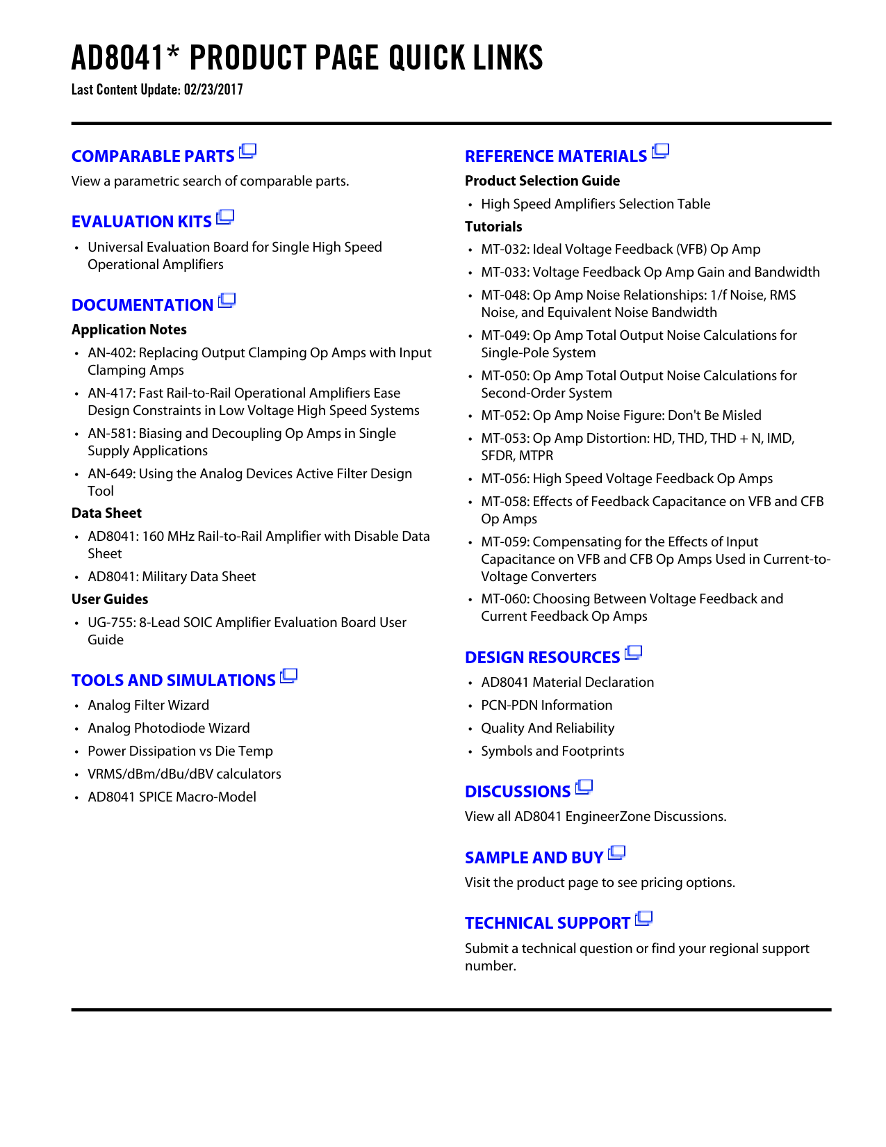 AD8041* PRODUCT PAGE QUICK LINKS Last Content Update: 02/23/2017COMPARABLE PARTSREFERENCE MATERIALS View a parametric search of comparable parts. Product Selection Guide • High Speed Amplifiers Selection Table EVALUATION KITSTutorials • Universal Evaluation Board for Single High Speed • MT-032: Ideal Voltage Feedback (VFB) Op Amp Operational Amplifiers • MT-033: Voltage Feedback Op Amp Gain and Bandwidth • MT-048: Op Amp Noise Relationships: 1/f Noise, RMS DOCUMENTATION Noise, and Equivalent Noise Bandwidth Application Notes • MT-049: Op Amp Total Output Noise Calculations for • AN-402: Replacing Output Clamping Op Amps with Input Single-Pole System Clamping Amps • MT-050: Op Amp Total Output Noise Calculations for • AN-417: Fast Rail-to-Rail Operational Amplifiers Ease Second-Order System Design Constraints in Low Voltage High Speed Systems • MT-052: Op Amp Noise Figure: Don't Be Misled • AN-581: Biasing and Decoupling Op Amps in Single • MT-053: Op Amp Distortion: HD, THD, THD + N, IMD, Supply Applications SFDR, MTPR • AN-649: Using the Analog Devices Active Filter Design • MT-056: High Speed Voltage Feedback Op Amps Tool • MT-058: Effects of Feedback Capacitance on VFB and CFB Data Sheet Op Amps • AD8041: 160 MHz Rail-to-Rail Amplifier with Disable Data • MT-059: Compensating for the Effects of Input Sheet Capacitance on VFB and CFB Op Amps Used in Current-to- • AD8041: Military Data Sheet Voltage Converters User Guides • MT-060: Choosing Between Voltage Feedback and • UG-755: 8-Lead SOIC Amplifier Evaluation Board User Current Feedback Op Amps Guide DESIGN RESOURCESTOOLS AND SIMULATIONS • AD8041 Material Declaration • Analog Filter Wizard • PCN-PDN Information • Analog Photodiode Wizard • Quality And Reliability • Power Dissipation vs Die Temp • Symbols and Footprints • VRMS/dBm/dBu/dBV calculators • AD8041 SPICE Macro-Model DISCUSSIONS View all AD8041 EngineerZone Discussions. SAMPLE AND BUY Visit the product page to see pricing options. TECHNICAL SUPPORT Submit a technical question or find your regional support number. Document Outline FEATURES APPLICATIONS PRODUCT DESCRIPTION CONNECTION DIAGRAM SPECIFICATIONS ABSOLUTE MAXIMUM RATINGS MAXIMUM POWER DISSIPATION ORDERING GUIDE Typical Performance Characteristics Overdrive Recovery Circuit Description Output Impedance Disable Operation Single-Supply A/D Conversion APPLICATIONS RGB Buffer Single-Supply Composite Video Line Driver Sync Stripper Layout Considerations OUTLINE DIMENSIONS Revision History