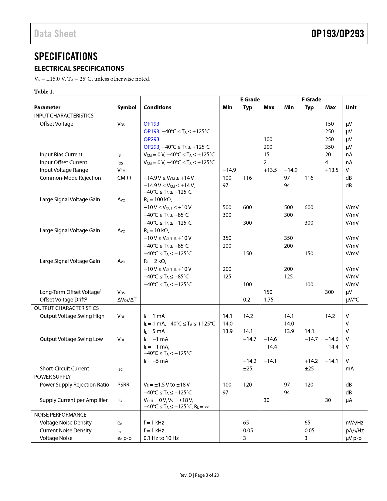 Data Sheet. OP193/OP293. SPECIFICATIONS ELECTRICAL SPECIFICATIONS. Table 1. E Grade. F Grade. Parameter. Symbol Conditions. Min. Typ. Max