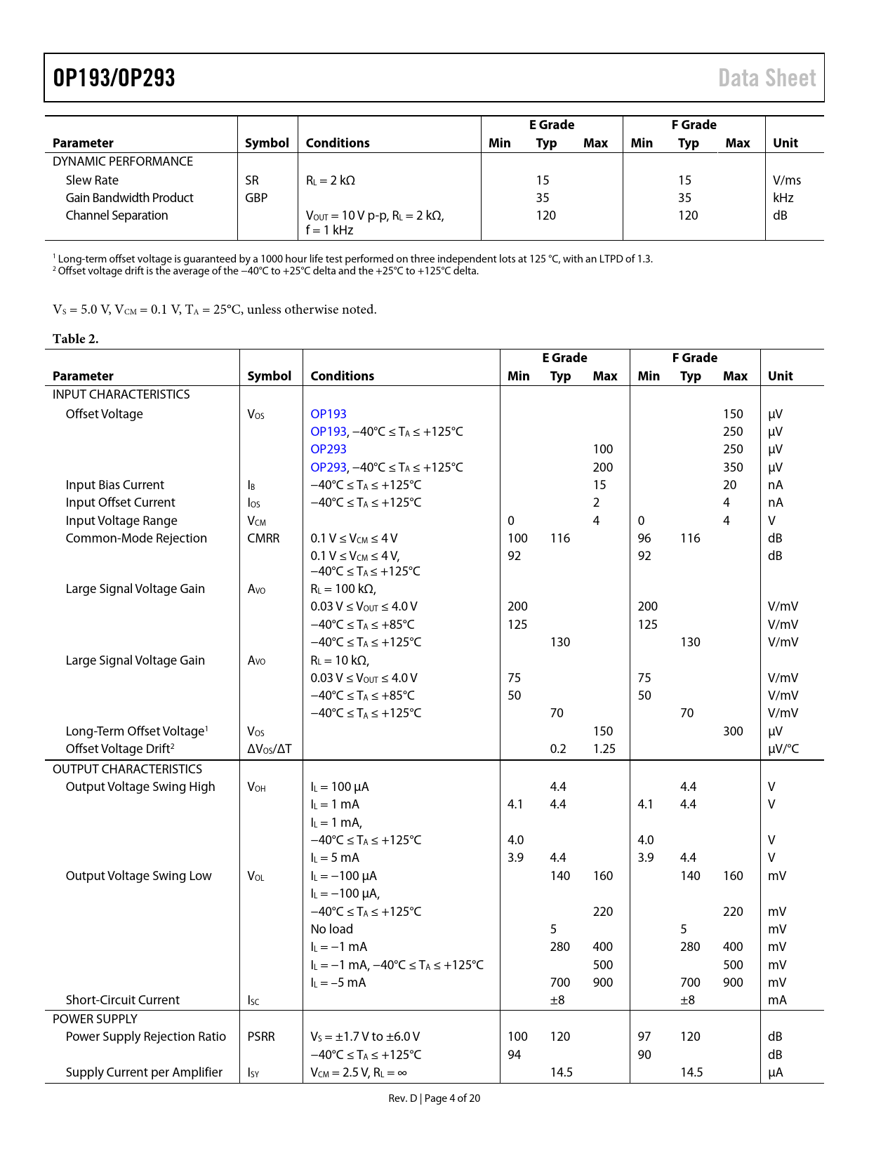 OP193/OP293 Data Sheet E Grade F Grade Parameter Symbol Conditions Min Typ Max Unit Table 2 Symbol Conditions