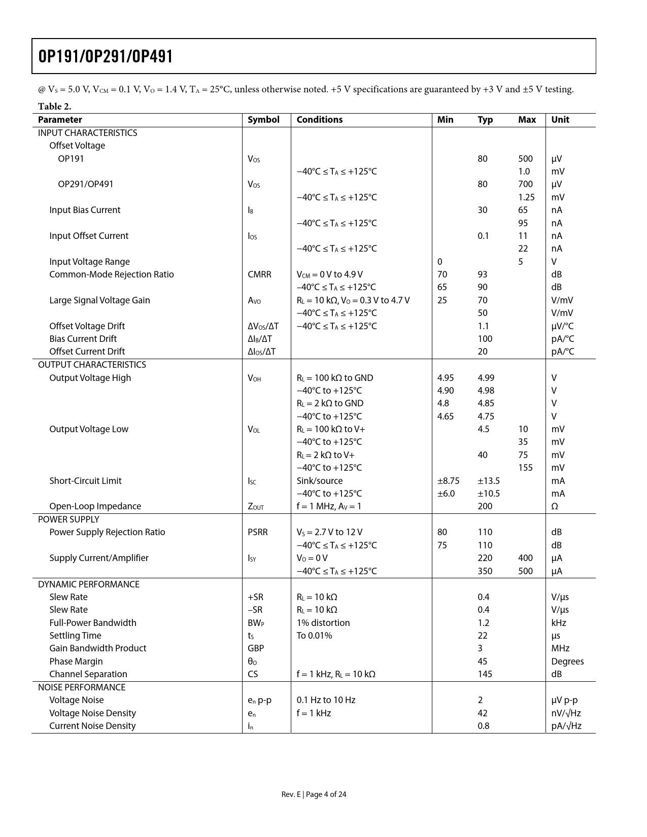 Pages / Page24 / 4 — OP191/OP291/OP491. Table 2. Parameter Symbol. Conditions. Min. Typ. Max. …