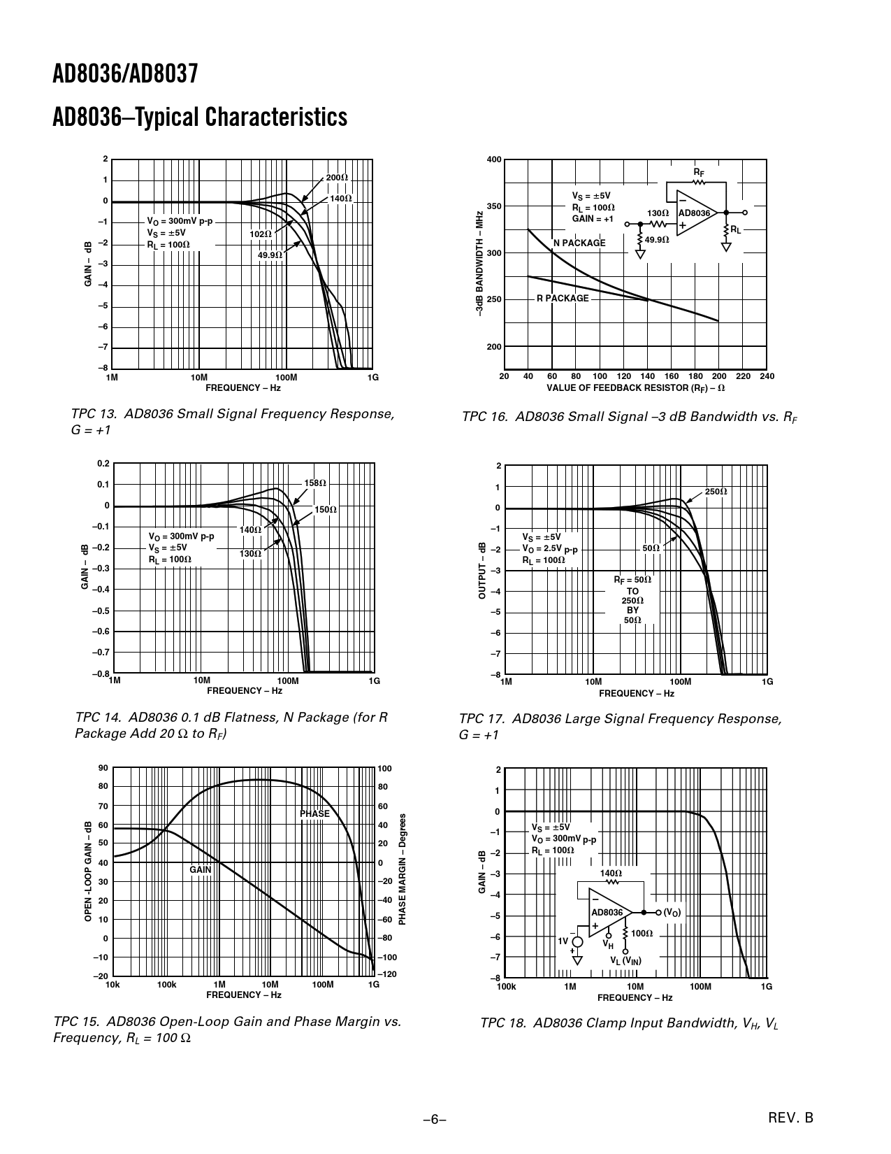 TPC 15. AD8036 Open-Loop Gain and Phase Margin vs. TPC 18. AD8036 Clamp Input Bandwidth, VH, VL Frequency, RL = 100 Ω –6– REV. B