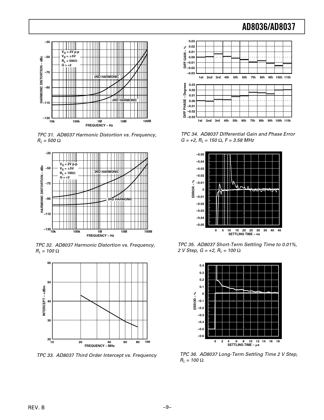 TPC 31. AD8037 Harmonic Distortion vs. Frequency, TPC 34. AD8037 Differential Gain and Phase Error R G = +2, R L = 500 Ω L = 150 Ω, F = 3.58 MHz