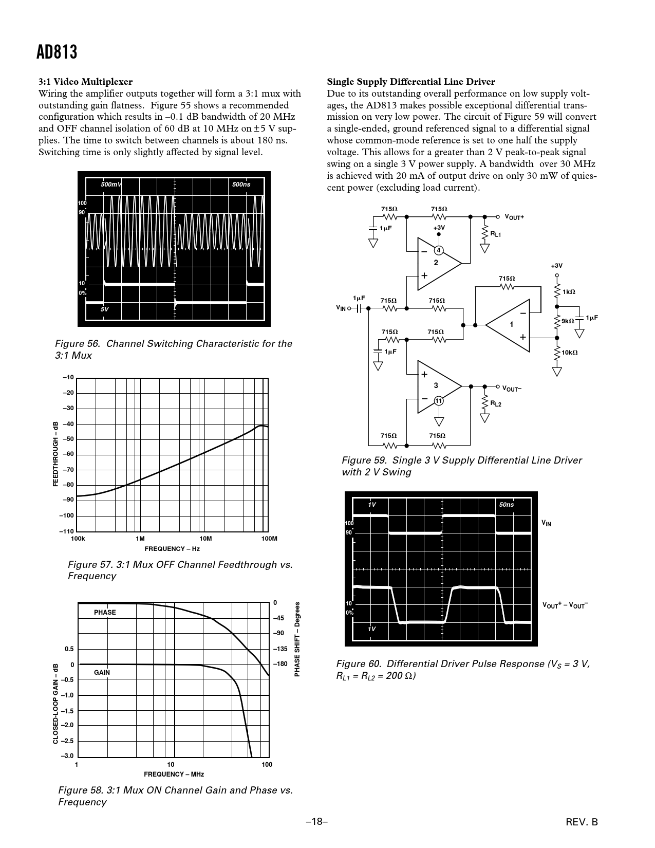 AD8133:1 Video MultiplexerSingle Supply Differential Line Driver Wiring the amplifier outputs together will form a 3:1 mux with Due to its outstanding overall performance on low supply volt- outstanding gain flatness. Figure 55 shows a recommended ages, the AD813 makes possible exceptional differential trans- configuration which results in –0.1 dB bandwidth of 20 MHz mission on very low power. The circuit of Figure 59 will convert and OFF channel isolation of 60 dB at 10 MHz on ± 5 V sup- a single-ended, ground referenced signal to a differential signal plies. The time to switch between channels is about 180 ns. whose common-mode reference is set to one half the supply Switching time is only slightly affected by signal level. voltage. This allows for a greater than 2 V peak-to-peak signal swing on a single 3 V power supply. A bandwidth over 30 MHz is achieved with 20 mA of output drive on only 30 mW of quies- 500mV500ns cent power (excluding load current). 100715 V 715 V 90VOUT+1+3V m FRL142+3V715 V 100%1k V 1 m F715 V 715 V V5VIN1 m F19k V 715 V 715 V Figure 56. Channel Switching Characteristic for the 1 m F10k V 3:1 Mux –103VOUT––2011RL2–30–40715 V 715 V –50–60 Figure 59. Single 3 V Supply Differential Line Driver –70 with 2 V Swing FEEDTHROUGH – dB –80–901V50ns–100100VIN–11090100k1M10M100MFREQUENCY – Hz Figure 57. 3:1 Mux OFF Channel Feedthrough vs. Frequency 010V+–OUT – VOUTPHASE0%–451V–900.5–1350–180 Figure 60. Differential Driver Pulse Response (VS = 3 V, GAINPHASE SHIFT – Degrees RL1 = RL2 = 200 Ω) –0.5–1.0–1.5–2.0CLOSED-LOOP GAIN – dB –2.5–3.0110100FREQUENCY – MHz Figure 58. 3:1 Mux ON Channel Gain and Phase vs. Frequency –18– REV. B