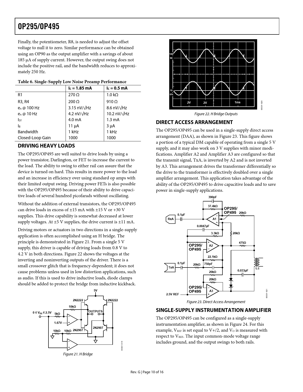 link to page 10 link to page 10 link to page 10 link to page 11 OP295/OP495 Finally, the potentiometer, R8, is needed to adjust the offset voltage to null it to zero. Similar performance can be obtained using an OP90 as the output amplifier with a savings of about 100 185 μA of supply current. However, the output swing does not 90 include the positive rail, and the bandwidth reduces to approxi- mately 250 Hz. Table 6. Single-Supply Low Noise Preamp PerformanceIC = 1.85 mAIC = 0.5 mA10 R1 270 Ω 1.0 kΩ 0% R3, R4 200 Ω 910 Ω 2V2V1ms 0 2 0 1- e 33 n @ 100 Hz 3.15 nV/√Hz 8.6 nV/√Hz 00 en @ 10 Hz 4.2 nV/√Hz 10.2 nV/√Hz Figure 22. H Bridge Outputs ISY 4.0 mA 1.3 mA DIRECT ACCESS ARRANGEMENT IB 11 μA 3 μA Bandwidth 1 kHz 1 kHz The OP295/OP495 can be used in a single-supply direct access Closed-Loop Gain 1000 1000 arrangement (DAA), as shown in Figure 23. This figure shows a portion of a typical DM capable of operating from a single 5 V DRIVING HEAVY LOADS supply, and it may also work on 3 V supplies with minor modi- The OP295/OP495 are well suited to drive loads by using a fications. Amplifier A2 and Amplifier A3 are configured so that power transistor, Darlington, or FET to increase the current to the transmit signal, TxA, is inverted by A2 and is not inverted the load. The ability to swing to either rail can assure that the by A3. This arrangement drives the transformer differentially so device is turned on hard. This results in more power to the load the drive to the transformer is effectively doubled over a single and an increase in efficiency over using standard op amps with amplifier arrangement. This application takes advantage of the their limited output swing. Driving power FETs is also possible ability of the OP295/OP495 to drive capacitive loads and to save with the OP295/OP495 because of their ability to drive capaci- power in single-supply applications. tive loads of several hundred picofarads without oscillating. 390pF Without the addition of external transistors, the OP295/OP495 37.4kΩ can drive loads in excess of ±15 mA with ±15 V or +30 V OP295/OP495 20kΩ supplies. This drive capability is somewhat decreased at lower 0.1µF–RxAA1 supply voltages. At ±5 V supplies, the drive current is ±11 mA. +0.0047µF Driving motors or actuators in two directions in a single-supply 3.3kΩ20kΩ application is often accomplished using an H bridge. The principle is demonstrated in Figure 21. From a single 5 V +475ΩOP295/A2 supply, this driver is capable of driving loads from 0.8 V to –OP495 4.2 V in both directions. Figure 22 shows the voltages at the 22.1kΩ inverting and noninverting outputs of the driver. There is a 0.1µF750pF small crossover glitch that is frequency-dependent; it does not 20kΩTxA1:1 cause problems unless used in low distortion applications, such 20kΩ0.033µF as audio. If this is used to drive inductive loads, diode clamps 20kΩ should be added to protect the bridge from inductive kickback. OP295/–5VOP495A3 21 0 2.5V REF+ 1- 33 00 2N22222N2222 Figure 23. Direct Access Arrangement 10kΩOUTPUTSSINGLE-SUPPLY INSTRUMENTATION AMPLIFIER0 ≤ VIN ≤ 2.5V 5kΩ– The OP295/OP495 can be configured as a single-supply 1.67V+ instrumentation amplifier, as shown in Figure 24. For this 2N290710kΩ10kΩ 2N2907 example, VREF is set equal to V+/2, and VO is measured with respect to VREF. The input common-mode voltage range – 19 includes ground, and the output swings to both rails. 0 1- + 033 0 Figure 21. H Bridge Rev. G | Page 10 of 16 Document Outline FEATURES APPLICATIONS GENERAL DESCRIPTION PIN CONFIGURATIONS TABLE OF CONTENTS REVISION HISTORY SPECIFICATIONS ELECTRICAL CHARACTERISTICS ABSOLUTE MAXIMUM RATINGS THERMAL RESISTANCE ESD CAUTION TYPICAL PERFORMANCE CHARACTERISTICS APPLICATIONS RAIL-TO-RAIL APPLICATION INFORMATION LOW DROP-OUT REFERENCE LOW NOISE, SINGLE-SUPPLY PREAMPLIFIER DRIVING HEAVY LOADS DIRECT ACCESS ARRANGEMENT SINGLE-SUPPLY INSTRUMENTATION AMPLIFIER SINGLE-SUPPLY RTD THERMOMETER AMPLIFIER COLD JUNCTION COMPENSATED, BATTERY-POWERED THERMOCOUPLE AMPLIFIER 5 V ONLY, 12-BIT DAC THAT SWINGS 0 V TO 4.095 V 4 mA TO 20 mA CURRENT-LOOP TRANSMITTER 3 V LOW DROPOUT LINEAR VOLTAGE REGULATOR LOW DROPOUT, 500 mA VOLTAGE REGULATOR WITH FOLDBACK CURRENT LIMITING SQUARE WAVE OSCILLATOR SINGLE-SUPPLY DIFFERENTIAL SPEAKER DRIVER HIGH ACCURACY, SINGLE-SUPPLY, LOW POWER COMPARATOR OUTLINE DIMENSIONS ORDERING GUIDE