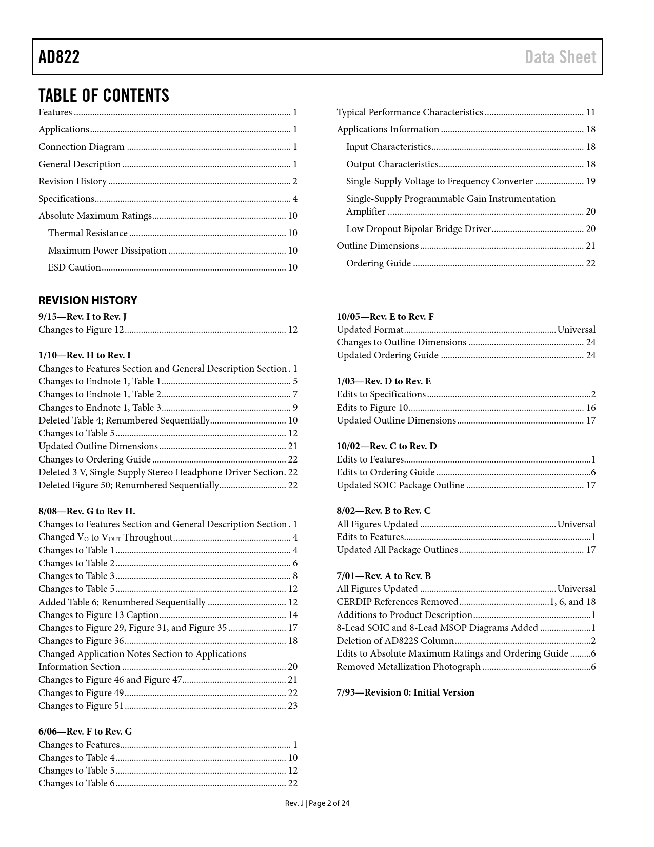 link to page 1 link to page 1 link to page 1 link to page 1 link to page 3 link to page 5 link to page 11 link to page 11 link to page 11 link to page 11 link to page 12 link to page 19 link to page 19 link to page 19 link to page 20 link to page 21 link to page 21 link to page 21 link to page 22 link to page 23 AD822Data SheetTABLE OF CONTENTS Features .. 1 Typical Performance Characteristics ... 11 Applications ... 1 Applications Information .. 18 Connection Diagram ... 1 Input Characteristics .. 18 General Description ... 1 Output Characteristics... 18 Revision History ... 2 Single-Supply Voltage to Frequency Converter ... 19 Specifications ... 4 Single-Supply Programmable Gain Instrumentation Absolute Maximum Ratings .. 10 Amplifier ... 20 Thermal Resistance .. 10 Low Dropout Bipolar Bridge Driver .. 20 Maximum Power Dissipation ... 10 Outline Dimensions ... 21 ESD Caution .. 10 Ordering Guide .. 22 REVISION HISTORY 9/15—Rev. I to Rev. J10/05—Rev. E to Rev. F Changes to Figure 12 .. 12 Updated Format .. Universal Changes to Outline Dimensions .. 24 1/10—Rev. H to Rev. I Updated Ordering Guide .. 24 Changes to Features Section and General Description Section . 1 Changes to Endnote 1, Table 1 .. 5 1/03—Rev. D to Rev. E Changes to Endnote 1, Table 2 .. 7 Edits to Specifications ... 2 Changes to Endnote 1, Table 3 .. 9 Edits to Figure 10 .. 16 Deleted Table 4; Renumbered Sequential y... 10 Updated Outline Dimensions ... 17 Changes to Table 5 .. 12 Updated Outline Dimensions ... 21 10/02—Rev. C to Rev. D Changes to Ordering Guide .. 22 Edits to Features... 1 Deleted 3 V, Single-Supply Stereo Headphone Driver Section . 22 Edits to Ordering Guide ... 6 Deleted Figure 50; Renumbered Sequentially... 22 Updated SOIC Package Outline ... 17 8/08—Rev. G to Rev H.8/02—Rev. B to Rev. C Changes to Features Section and General Description Section . 1 All Figures Updated ... Universal Changed VO to VOUT Throughout ... 4 Edits to Features... 1 Changes to Table 1 .. 4 Updated All Package Outlines .. 17 Changes to Table 2 .. 6 Changes to Table 3 .. 8 7/01—Rev. A to Rev. B Changes to Table 5 .. 12 All Figures Updated ... Universal Added Table 6; Renumbered Sequential y .. 12 CERDIP References Removed ... 1, 6, and 18 Changes to Figure 13 Caption ... 14 Additions to Product Description ... 1 Changes to Figure 29, Figure 31, and Figure 35 ... 17 8-Lead SOIC and 8-Lead MSOP Diagrams Added .. 1 Changes to Figure 36 .. 18 Deletion of AD822S Column ... 2 Changed Application Notes Section to Applications Edits to Absolute Maximum Ratings and Ordering Guide ... 6 Information Section ... 20 Removed Metal ization Photograph ... 6 Changes to Figure 46 and Figure 47 ... 21 Changes to Figure 49 .. 22 7/93—Revision 0: Initial Version Changes to Figure 51 .. 23 6/06—Rev. F to Rev. G Changes to Features .. 1 Changes to Table 4 .. 10 Changes to Table 5 .. 12 Changes to Table 6 .. 22 Rev. J | Page 2 of 24 Document Outline FEATURES APPLICATIONS CONNECTION DIAGRAM GENERAL DESCRIPTION REVISION HISTORY SPECIFICATIONS ABSOLUTE MAXIMUM RATINGS THERMAL RESISTANCE MAXIMUM POWER DISSIPATION ESD CAUTION TYPICAL PERFORMANCE CHARACTERISTICS APPLICATIONS INFORMATION INPUT CHARACTERISTICS OUTPUT CHARACTERISTICS SINGLE-SUPPLY VOLTAGE TO FREQUENCY CONVERTER LOW DROPOUT BIPOLAR BRIDGE DRIVER OUTLINE DIMENSIONS ORDERING GUIDE
