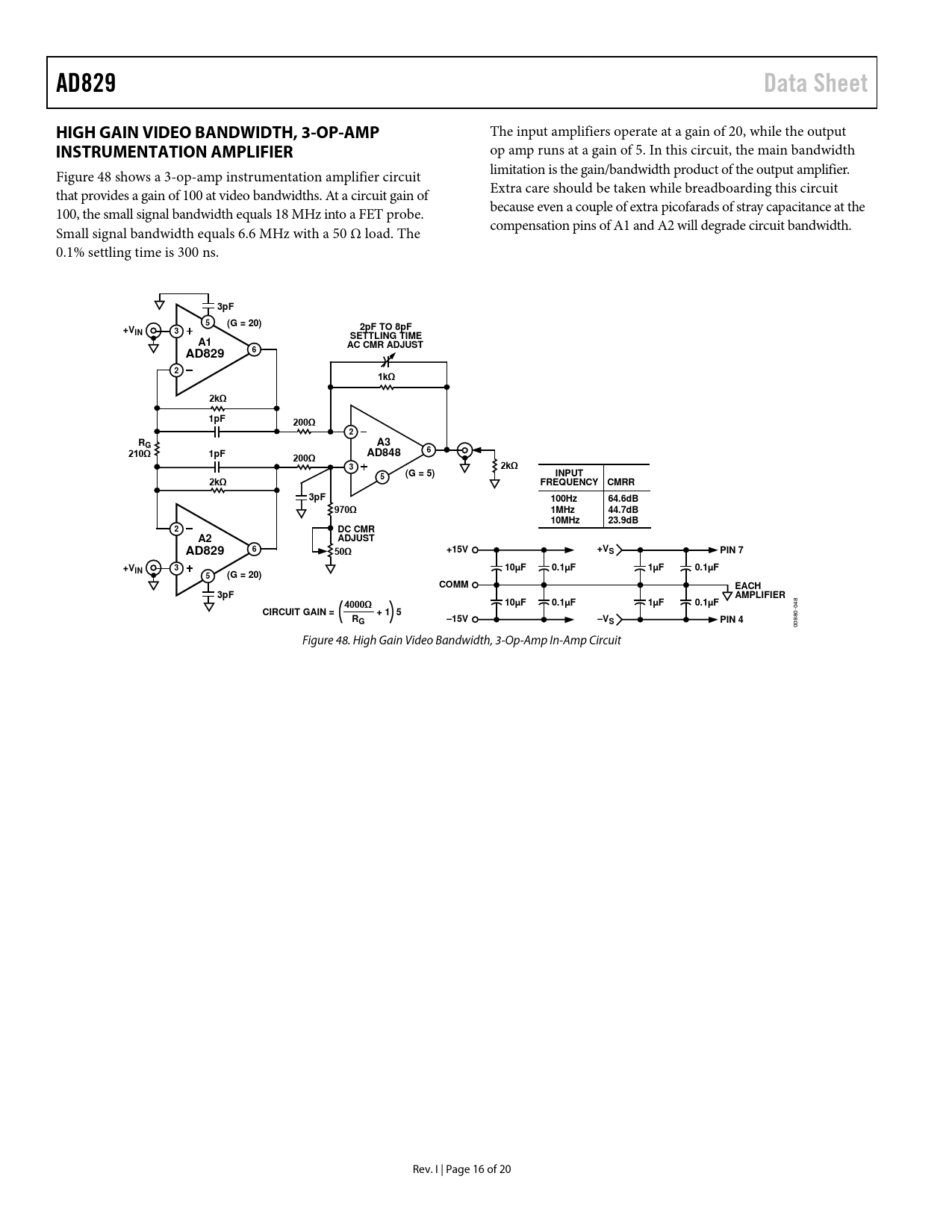AD829 Data Sheet HIGH GAIN VIDEO BANDWIDTH, 3-OP-AMP INSTRUMENTATION AMPLIFIER 3pF (G = 20) 2pF TO 8pF +VIN SETTLING TIME