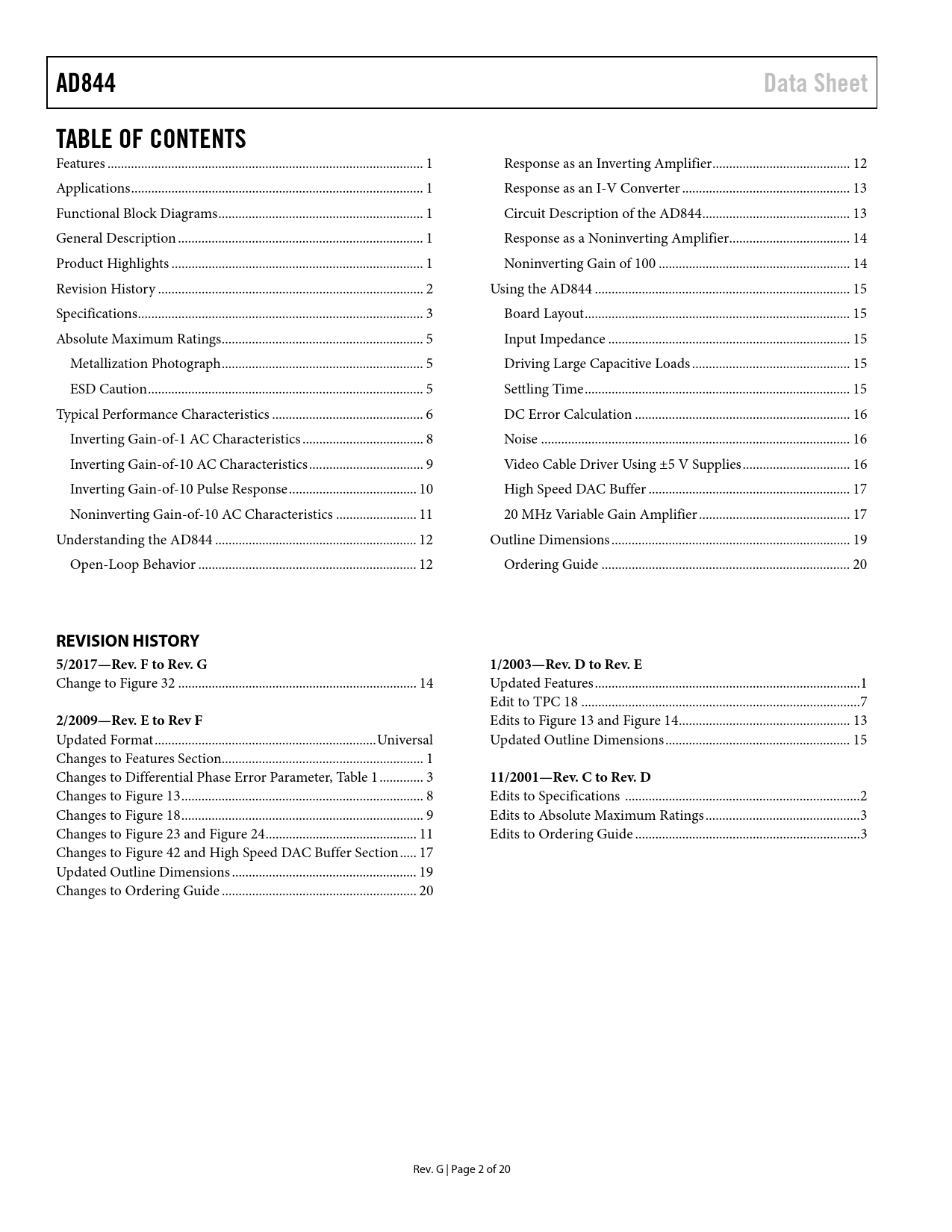 link to page 1 link to page 1 link to page 1 link to page 1 link to page 1 link to page 2 link to page 3 link to page 5 link to page 5 link to page 5 link to page 6 link to page 8 link to page 9 link to page 10 link to page 11 link to page 12 link to page 12 link to page 12 link to page 13 link to page 13 link to page 14 link to page 14 link to page 15 link to page 15 link to page 15 link to page 15 link to page 15 link to page 16 link to page 16 link to page 16 link to page 17 link to page 17 link to page 19 link to page 20 AD844Data SheetTABLE OF CONTENTS Features .. 1 Response as an Inverting Amplifier ... 12 Applications ... 1 Response as an I-V Converter .. 13 Functional Block Diagrams ... 1 Circuit Description of the AD844 .. 13 General Description ... 1 Response as a Noninverting Amplifier .. 14 Product Highlights ... 1 Noninverting Gain of 100 ... 14 Revision History ... 2 Using the AD844 .. 15 Specifications ... 3 Board Layout ... 15 Absolute Maximum Ratings .. 5 Input Impedance .. 15 Metallization Photograph .. 5 Driving Large Capacitive Loads ... 15 ESD Caution .. 5 Settling Time ... 15 Typical Performance Characteristics ... 6 DC Error Calculation .. 16 Inverting Gain-of-1 AC Characteristics .. 8 Noise .. 16 Inverting Gain-of-10 AC Characteristics .. 9 Video Cable Driver Using ±5 V Supplies .. 16 Inverting Gain-of-10 Pulse Response .. 10 High Speed DAC Buffer .. 17 Noninverting Gain-of-10 AC Characteristics .. 11 20 MHz Variable Gain Amplifier ... 17 Understanding the AD844 .. 12 Outline Dimensions ... 19 Open-Loop Behavior ... 12 Ordering Guide .. 20 REVISION HISTORY5/2017—Rev. F to Rev. G1/2003—Rev. D to Rev. E Change to Figure 32 ... 14 Updated Features ... 1 Edit to TPC 18 ... 7 2/2009—Rev. E to Rev F Edits to Figure 13 and Figure 14 ... 13 Updated Format .. Universal Updated Outline Dimensions ... 15 Changes to Features Section.. 1 Changes to Differential Phase Error Parameter, Table 1 ... 3 11/2001—Rev. C to Rev. D Changes to Figure 13 .. 8 Edits to Specifications .. 2 Changes to Figure 18 .. 9 Edits to Absolute Maximum Ratings .. 3 Changes to Figure 23 and Figure 24 ... 11 Edits to Ordering Guide ... 3 Changes to Figure 42 and High Speed DAC Buffer Section ... 17 Updated Outline Dimensions ... 19 Changes to Ordering Guide .. 20 Rev. G | Page 2 of 20 Document Outline FEATURES APPLICATIONS FUNCTIONAL BLOCK DIAGRAMS GENERAL DESCRIPTION PRODUCT HIGHLIGHTS TABLE OF CONTENTS REVISION HISTORY SPECIFICATIONS ABSOLUTE MAXIMUM RATINGS METALLIZATION PHOTOGRAPH ESD CAUTION TYPICAL PERFORMANCE CHARACTERISTICS INVERTING GAIN-OF-1 AC CHARACTERISTICS INVERTING GAIN-OF-10 AC CHARACTERISTICS INVERTING GAIN-OF-10 PULSE RESPONSE NONINVERTING GAIN-OF-10 AC CHARACTERISTICS UNDERSTANDING THE AD844 OPEN-LOOP BEHAVIOR RESPONSE AS AN INVERTING AMPLIFIER RESPONSE AS AN I-V CONVERTER CIRCUIT DESCRIPTION OF THE AD844 RESPONSE AS A NONINVERTING AMPLIFIER NONINVERTING GAIN OF 100 USING THE AD844 BOARD LAYOUT INPUT IMPEDANCE DRIVING LARGE CAPACITIVE LOADS SETTLING TIME DC ERROR CALCULATION NOISE VIDEO CABLE DRIVER USING ±5 V SUPPLIES HIGH SPEED DAC BUFFER 20 MHZ VARIABLE GAIN AMPLIFIER OUTLINE DIMENSIONS ORDERING GUIDE