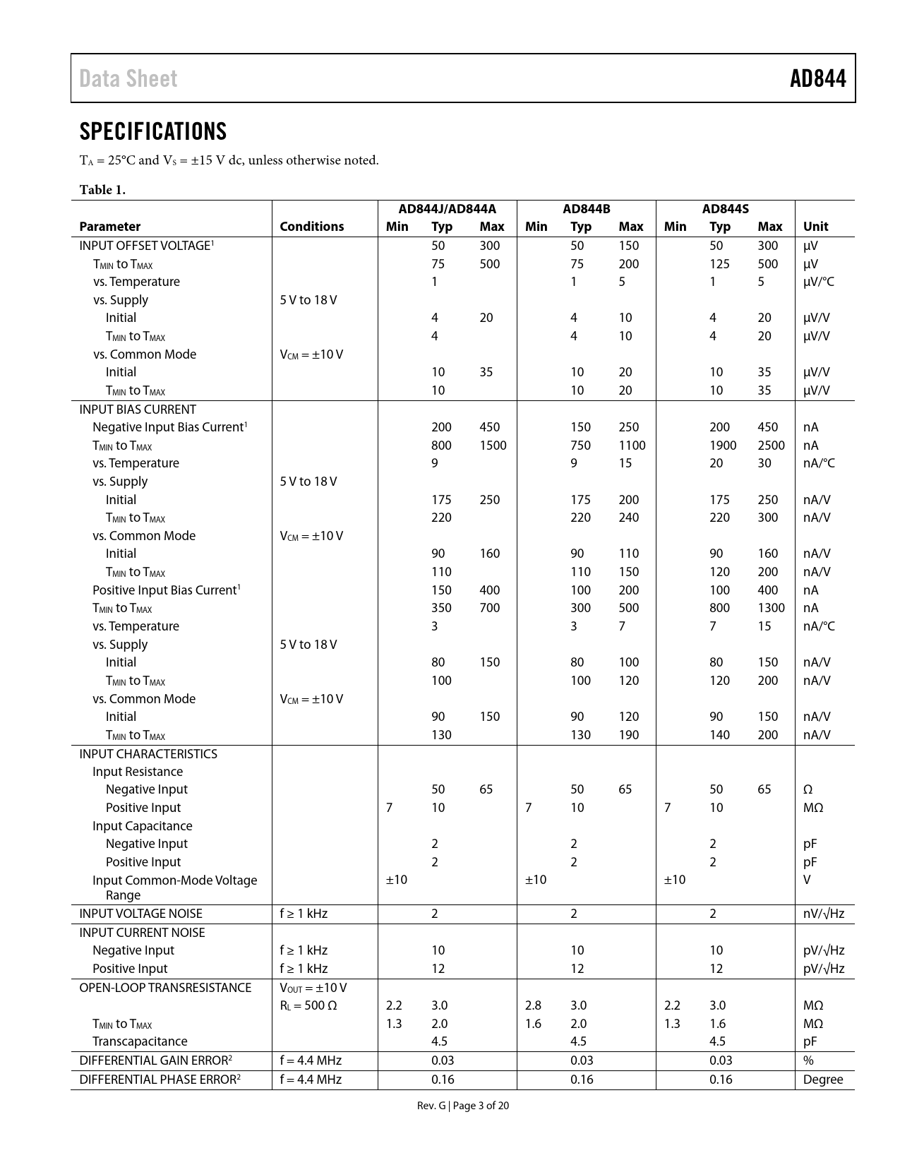 | Pages / Page | 20 / 3 — Data Sheet. AD844. SPECIFICATIONS. Table 1. AD844J/AD844A. AD844B. … |
