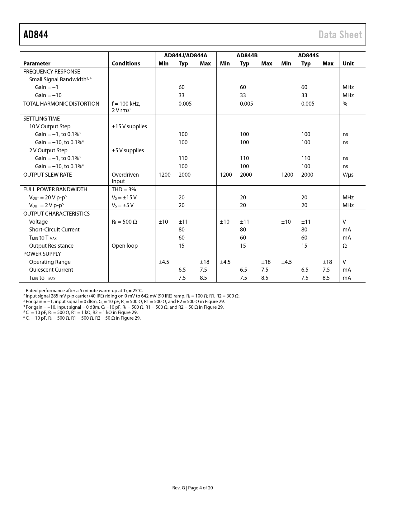 link to page 12 link to page 12 link to page 12 link to page 12 AD844Data SheetAD844J/AD844AAD844BAD844SParameterConditionsMinTypMaxMinTypMaxMinTypMaxUnit FREQUENCY RESPONSE Small Signal Bandwidth3, 4 Gain = −1 60 60 60 MHz Gain = −10 33 33 33 MHz TOTAL HARMONIC DISTORTION f = 100 kHz, 0.005 0.005 0.005 % 2 V rms5 SETTLING TIME 10 V Output Step ±15 V supplies Gain = −1, to 0.1%5 100 100 100 ns Gain = −10, to 0.1%6 100 100 100 ns 2 V Output Step ±5 V supplies Gain = −1, to 0.1%5 110 110 110 ns Gain = −10, to 0.1%6 100 100 100 ns OUTPUT SLEW RATE Overdriven 1200 2000 1200 2000 1200 2000 V/μs input FULL POWER BANDWIDTH THD = 3% VOUT = 20 V p-p5 VS = ±15 V 20 20 20 MHz VOUT = 2 V p-p5 VS = ±5 V 20 20 20 MHz OUTPUT CHARACTERISTICS Voltage RL = 500 Ω ±10 ±11 ±10 ±11 ±10 ±11 V Short-Circuit Current 80 80 80 mA TMIN to T MAX 60 60 60 mA Output Resistance Open loop 15 15 15 Ω POWER SUPPLY Operating Range ±4.5 ±18 ±4.5 ±18 ±4.5 ±18 V Quiescent Current 6.5 7.5 6.5 7.5 6.5 7.5 mA TMIN to TMAX 7.5 8.5 7.5 8.5 7.5 8.5 mA 1 Rated performance after a 5 minute warm-up at TA = 25°C. 2 Input signal 285 mV p-p carrier (40 IRE) riding on 0 mV to 642 mV (90 IRE) ramp. RL = 100 Ω; R1, R2 = 300 Ω. 3 For gain = −1, input signal = 0 dBm, CL = 10 pF, RL = 500 Ω, R1 = 500 Ω, and R2 = 500 Ω in Figure 29. 4 For gain = −10, input signal = 0 dBm, CL =10 pF, RL = 500 Ω, R1 = 500 Ω, and R2 = 50 Ω in Figure 29. 5 CL = 10 pF, RL = 500 Ω, R1 = 1 kΩ, R2 = 1 kΩ in Figure 29. 6 CL = 10 pF, RL = 500 Ω, R1 = 500 Ω, R2 = 50 Ω in Figure 29. Rev. G | Page 4 of 20 Document Outline FEATURES APPLICATIONS FUNCTIONAL BLOCK DIAGRAMS GENERAL DESCRIPTION PRODUCT HIGHLIGHTS TABLE OF CONTENTS REVISION HISTORY SPECIFICATIONS ABSOLUTE MAXIMUM RATINGS METALLIZATION PHOTOGRAPH ESD CAUTION TYPICAL PERFORMANCE CHARACTERISTICS INVERTING GAIN-OF-1 AC CHARACTERISTICS INVERTING GAIN-OF-10 AC CHARACTERISTICS INVERTING GAIN-OF-10 PULSE RESPONSE NONINVERTING GAIN-OF-10 AC CHARACTERISTICS UNDERSTANDING THE AD844 OPEN-LOOP BEHAVIOR RESPONSE AS AN INVERTING AMPLIFIER RESPONSE AS AN I-V CONVERTER CIRCUIT DESCRIPTION OF THE AD844 RESPONSE AS A NONINVERTING AMPLIFIER NONINVERTING GAIN OF 100 USING THE AD844 BOARD LAYOUT INPUT IMPEDANCE DRIVING LARGE CAPACITIVE LOADS SETTLING TIME DC ERROR CALCULATION NOISE VIDEO CABLE DRIVER USING ±5 V SUPPLIES HIGH SPEED DAC BUFFER 20 MHZ VARIABLE GAIN AMPLIFIER OUTLINE DIMENSIONS ORDERING GUIDE