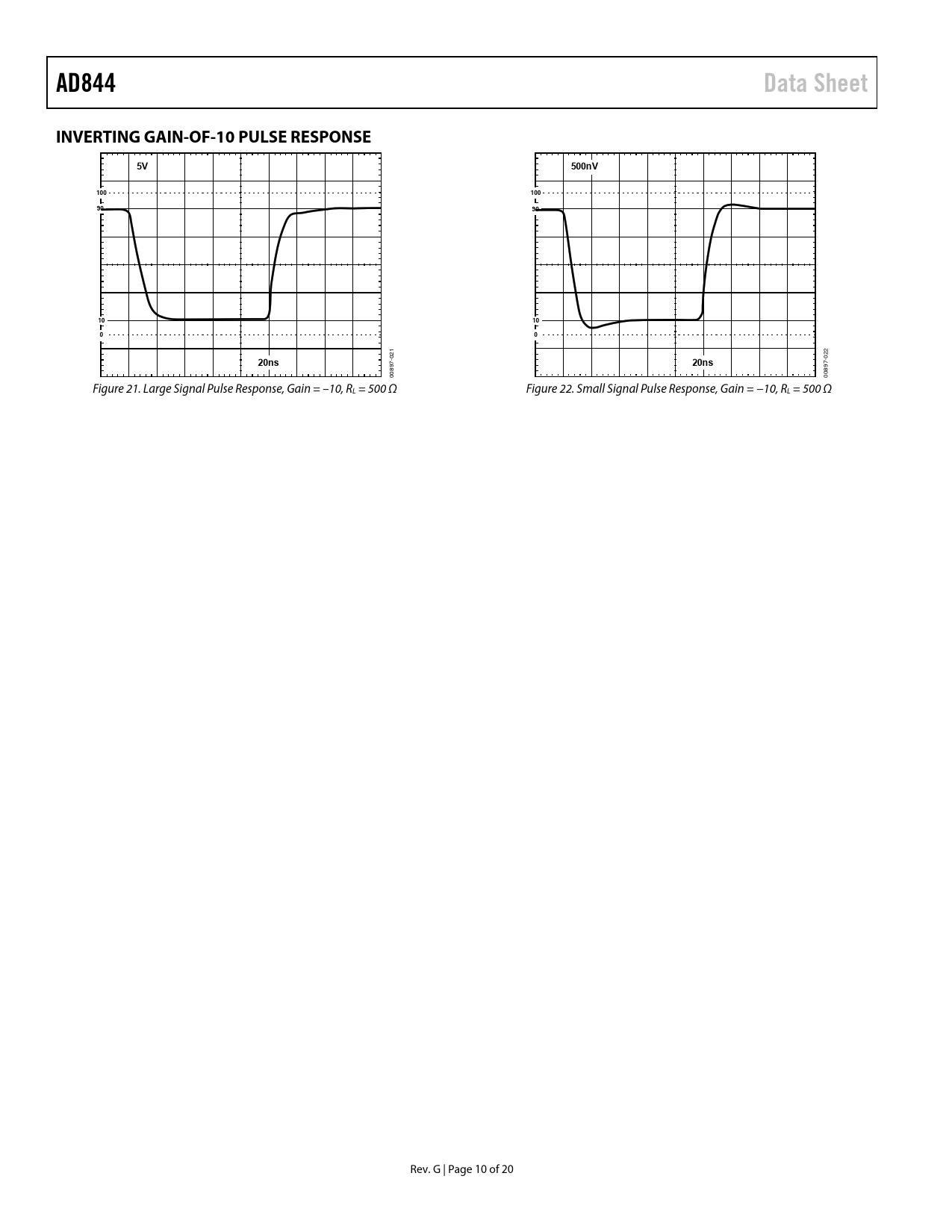 AD844Data SheetINVERTING GAIN-OF-10 PULSE RESPONSE5V500nV1001009090101000 21 22 -0 0 20ns20ns 97 97- 08 08 0 0 Figure 21. Large Signal Pulse Response, Gain = –10, RL = 500 Ω Figure 22. Small Signal Pulse Response, Gain = −10, RL = 500 Ω Rev. G | Page 10 of 20 Document Outline FEATURES APPLICATIONS FUNCTIONAL BLOCK DIAGRAMS GENERAL DESCRIPTION PRODUCT HIGHLIGHTS TABLE OF CONTENTS REVISION HISTORY SPECIFICATIONS ABSOLUTE MAXIMUM RATINGS METALLIZATION PHOTOGRAPH ESD CAUTION TYPICAL PERFORMANCE CHARACTERISTICS INVERTING GAIN-OF-1 AC CHARACTERISTICS INVERTING GAIN-OF-10 AC CHARACTERISTICS INVERTING GAIN-OF-10 PULSE RESPONSE NONINVERTING GAIN-OF-10 AC CHARACTERISTICS UNDERSTANDING THE AD844 OPEN-LOOP BEHAVIOR RESPONSE AS AN INVERTING AMPLIFIER RESPONSE AS AN I-V CONVERTER CIRCUIT DESCRIPTION OF THE AD844 RESPONSE AS A NONINVERTING AMPLIFIER NONINVERTING GAIN OF 100 USING THE AD844 BOARD LAYOUT INPUT IMPEDANCE DRIVING LARGE CAPACITIVE LOADS SETTLING TIME DC ERROR CALCULATION NOISE VIDEO CABLE DRIVER USING ±5 V SUPPLIES HIGH SPEED DAC BUFFER 20 MHZ VARIABLE GAIN AMPLIFIER OUTLINE DIMENSIONS ORDERING GUIDE