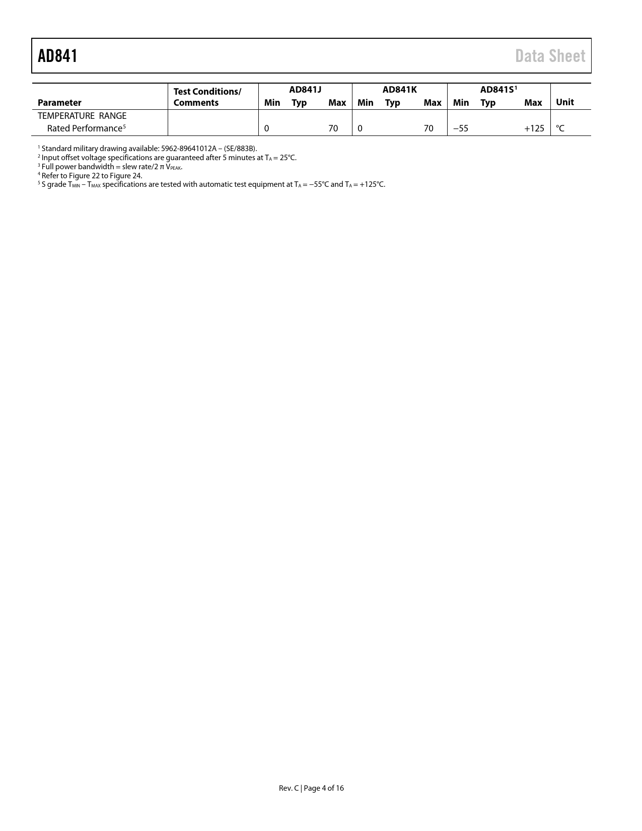 Pages / Page17 / 5 — AD841. Data Sheet. Test Conditions/. AD841J. AD841K. AD841S1. Parameter. …