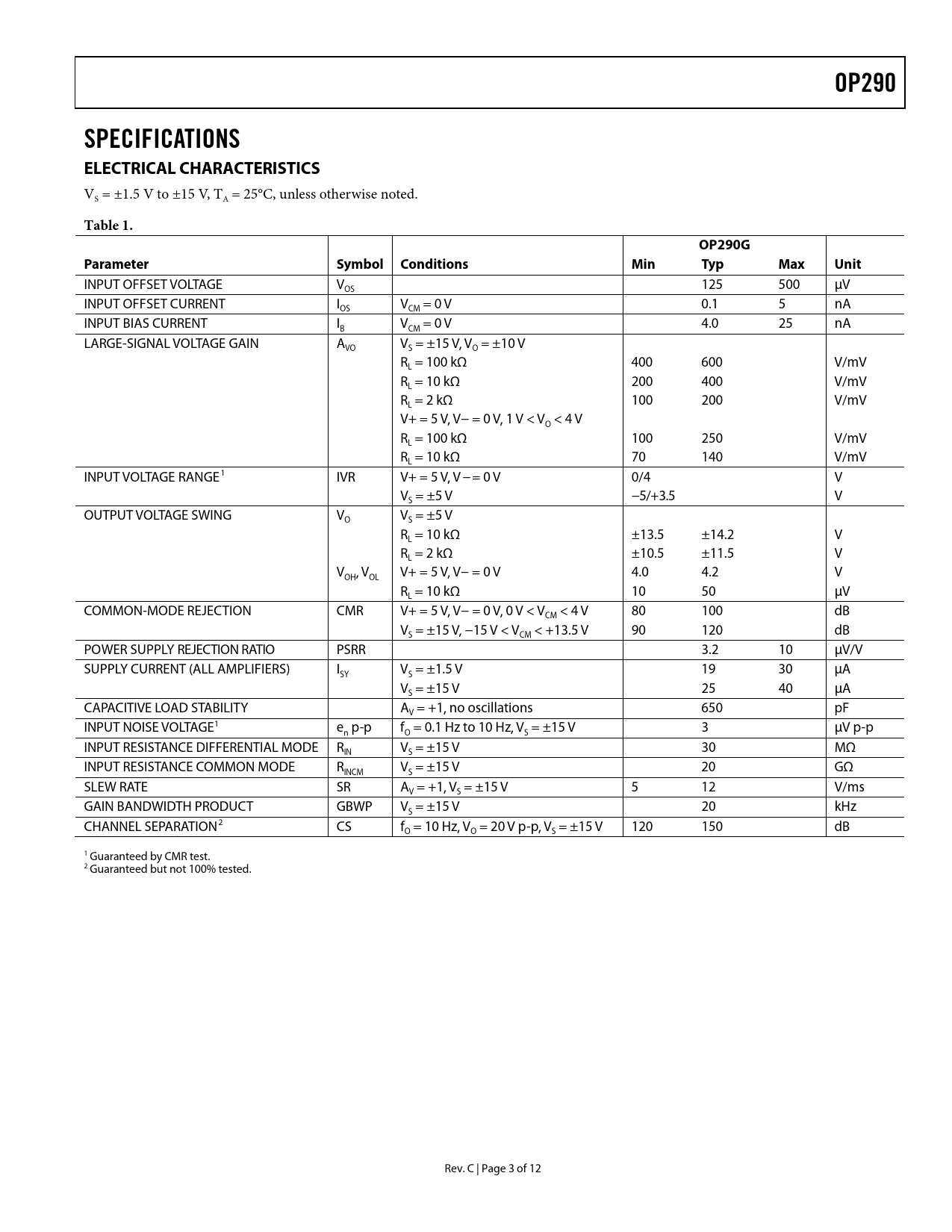 link to page 4 link to page 4 link to page 4 OP290SPECIFICATIONS ELECTRICAL CHARACTERISTICS VS = ±1.5 V to ±15 V, TA = 25°C, unless otherwise noted. Table 1.OP290GParameterSymbol ConditionsMinTypMaxUnit INPUT OFFSET VOLTAGE V 125 500 μV OS INPUT OFFSET CURRENT I V = 0 V 0.1 5 nA OS CM INPUT BIAS CURRENT I V = 0 V 4.0 25 nA B CM LARGE-SIGNAL VOLTAGE GAIN A V = ±15 V, V = ±10 V VO S O R = 100 kΩ 400 600 V/mV L R = 10 kΩ 200 400 V/mV L R = 2 kΩ 100 200 V/mV L V+ = 5 V, V− = 0 V, 1 V < V < 4 V O R = 100 kΩ 100 250 V/mV L R = 10 kΩ 70 140 V/mV L INPUT VOLTAGE RANGE1 IVR V+ = 5 V, V − = 0 V 0/4 V V = ±5 V −5/+3.5 V S OUTPUT VOLTAGE SWING V V = ±5 V O S R = 10 kΩ ±13.5 ±14.2 V L R = 2 kΩ ±10.5 ±11.5 V L V , V V+ = 5 V, V− = 0 V 4.0 4.2 V OH OL R = 10 kΩ 10 50 μV L COMMON-MODE REJECTION CMR V+ = 5 V, V− = 0 V, 0 V < V < 4 V 80 100 dB CM V = ±15 V, −15 V < V < +13.5 V 90 120 dB S CM POWER SUPPLY REJECTION RATIO PSRR 3.2 10 μV/V SUPPLY CURRENT (ALL AMPLIFIERS) I V = ±1.5 V 19 30 μA SY S V = ±15 V 25 40 μA S CAPACITIVE LOAD STABILITY A = +1, no oscillations 650 pF V INPUT NOISE VOLTAGE1 e p-p f = 0.1 Hz to 10 Hz, V = ±15 V 3 μV p-p n O S INPUT RESISTANCE DIFFERENTIAL MODE R V = ±15 V 30 MΩ IN S INPUT RESISTANCE COMMON MODE R V = ±15 V 20 GΩ INCM S SLEW RATE SR A = +1, V = ±15 V 5 12 V/ms V S GAIN BANDWIDTH PRODUCT GBWP V = ±15 V 20 kHz S CHANNEL SEPARATION2 CS f = 10 Hz, V = 20 V p-p, V = ±15 V 120 150 dB O O S 1 Guaranteed by CMR test. 2 Guaranteed but not 100% tested. Rev. C | Page 3 of 12 Document Outline Features Pin Connections General Description Revision History Specifications Electrical Characteristics Absolute Maximum Ratings ESD Caution Typical Performance Characteristics Theory of Operation Battery-Powered Applications Input Voltage Protection Single-Supply Output Voltage Range Applications Information Temperature to 4 mA to 20 mA Transmitter Variable Slew Rate Filter Low Overhead Voltage Reference Outline Dimensions Ordering Guide