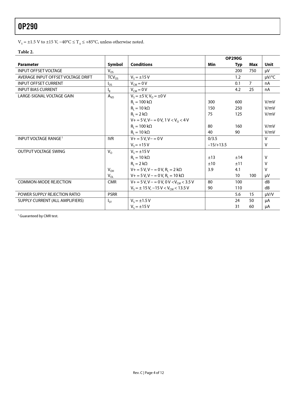 link to page 5 OP290 VS = ±1.5 V to ±15 V, −40°C ≤ TA ≤ +85°C, unless otherwise noted. Table 2.OP290GParameterSymbolConditionsMinTypMaxUnit INPUT OFFSET VOLTAGE V 200 750 μV OS AVERAGE INPUT OFFSET VOLTAGE DRIFT TCV V = ±15 V 1.2 μV/°C OS S INPUT OFFSET CURRENT I V = 0 V 0.1 7 nA OS CM INPUT BIAS CURRENT I V = 0 V 4.2 25 nA B CM LARGE-SIGNAL VOLTAGE GAIN A V = ±5 V, V = ±0 V VO S O R = 100 kΩ 300 600 V/mV L R = 10 kΩ 150 250 V/mV L R = 2 kΩ 75 125 V/mV L V+ = 5 V, V− = 0 V, 1 V < V < 4 V O R = 100 kΩ 80 160 V/mV L R = 10 kΩ 40 90 V/mV L INPUT VOLTAGE RANGE1 IVR V+ = 5 V, V− = 0 V 0/3.5 V V = +15 V –15/+13.5 V S OUTPUT VOLTAGE SWING V V = ±15 V O S R = 10 kΩ ±13 ±14 V L R = 2 kΩ ±10 ±11 V L V V+ = 5 V, V − = 0 V, R = 2 kΩ 3.9 4.1 V OH L V V+ = 5 V, V − = 0 V, R = 10 kΩ 10 100 μV OL L COMMON-MODE REJECTION CMR V+ = 5 V, V − = 0 V, 0 V < V < 3.5 V 80 100 dB CM V = ± 15 V, −15 V < V < 13.5 V 90 110 dB S CM POWER SUPPLY REJECTION RATIO PSRR 5.6 15 μV/V SUPPLY CURRENT (ALL AMPLIFIERS) I V = ±1.5 V 24 50 μA SY S V = ±15 V 31 60 μA S 1 Guaranteed by CMR test. Rev. C | Page 4 of 12 Document Outline Features Pin Connections General Description Revision History Specifications Electrical Characteristics Absolute Maximum Ratings ESD Caution Typical Performance Characteristics Theory of Operation Battery-Powered Applications Input Voltage Protection Single-Supply Output Voltage Range Applications Information Temperature to 4 mA to 20 mA Transmitter Variable Slew Rate Filter Low Overhead Voltage Reference Outline Dimensions Ordering Guide