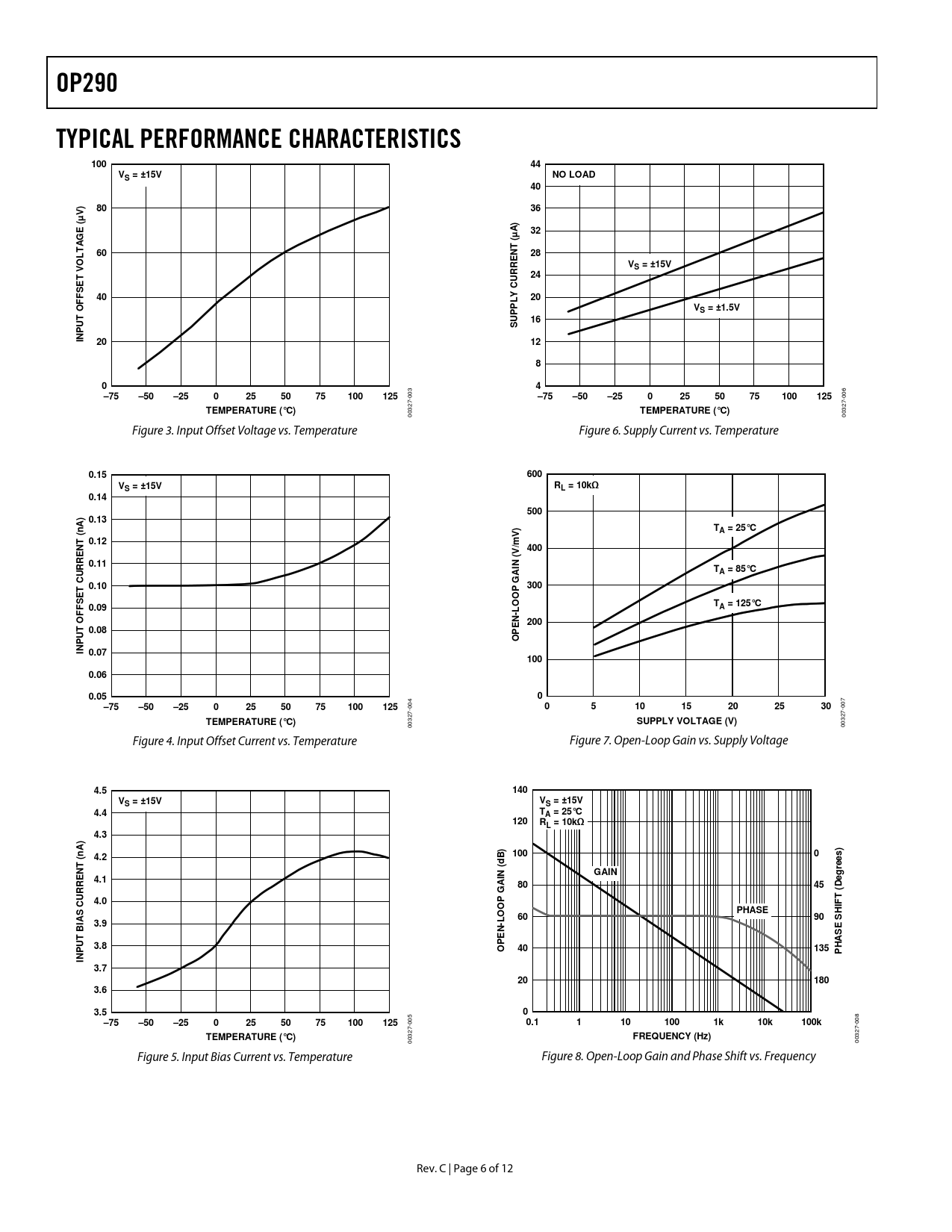 OP290TYPICAL PERFORMANCE CHARACTERISTICS10044VS = ±15VNO LOAD40)80V36µ (A)32GEµ (60NT28OLTAVS = ±15VT V24ECURRE40Y20L PVS = ±1.5VT OFFSUP16USP IN2012804–75–50–250255075100125 003 –75–50–250255075100125 006 TEMPERATURE (°C)TEMPERATURE (°C) 00327- 00327- Figure 3. Input Offset Voltage vs. Temperature Figure 6. Supply Current vs. Temperature 0.15600VS = ±15VRL = 10kΩ0.145000.13A) nTA = 25°C(V)0.12mNT400(V/0.11IN ATA = 85°CCURRE 0.10T300P GEOS FOT0.09A = 125°CF-LO2000.08UTPEN OINP 0.071000.060.050–75–50–250255075100125 004 051015202530 007 TEMPERATURE (°C)SUPPLY VOLTAGE (V) 00327- 00327- Figure 4. Input Offset Current vs. Temperature Figure 7. Open-Loop Gain vs. Supply Voltage 4.5140VS = ±15VVS = ±15V4.4TA = 25°C120RL = 10kΩ4.3A))n4.21000(dB (rees)NTGAIN4.1IN8045DegGA( T4.0FCURREPHASEHIAS6090S3.9-LOOPEBIN EUT3.8OP40135HAS PINP3.7201803.63.50–75–50–250255075100125 005 0.11101001k10k100k 008 TEMPERATURE (°C)FREQUENCY (Hz) 00327- 00327- Figure 5. Input Bias Current vs. Temperature Figure 8. Open-Loop Gain and Phase Shift vs. Frequency Rev. C | Page 6 of 12 Document Outline Features Pin Connections General Description Revision History Specifications Electrical Characteristics Absolute Maximum Ratings ESD Caution Typical Performance Characteristics Theory of Operation Battery-Powered Applications Input Voltage Protection Single-Supply Output Voltage Range Applications Information Temperature to 4 mA to 20 mA Transmitter Variable Slew Rate Filter Low Overhead Voltage Reference Outline Dimensions Ordering Guide