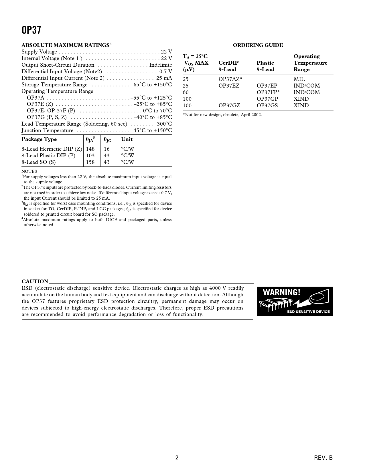 OP37ABSOLUTE MAXIMUM RATINGS4ORDERING GUIDE Supply Voltage . 22 V Internal Voltage (Note 1 ) . 22 V TA = 25 ∞ COperating Output Short-Circuit Duration . Indefinite VOS MAXCerDIPPlasticTemperature Differential Input Voltage (Note2) . 0.7 V (V)8-Lead8-LeadRange Differential Input Current (Note 2) . 25 mA 25 OP37AZ* MIL Storage Temperature Range . –65∞C to +150∞C 25 OP37EZ OP37EP IND/COM Operating Temperature Range 60 OP37FP* IND/COM OP37A . –55∞C to +125∞C 100 OP37GP XIND OP37E (Z) . –25∞C to +85∞C 100 OP37GZ OP37GS XIND OP37E, OP-37F (P) . 0∞C to 70∞C *Not for new design, obsolete, April 2002. OP37G (P, S, Z) . –40∞C to +85∞C Lead Temperature Range (Soldering, 60 sec) . 300∞C Junction Temperature . –45∞C to +150∞C Package Type3JAJCUnit 8-Lead Hermetic DIP (Z) 148 16 ∞C/W 8-Lead Plastic DIP (P) 103 43 ∞C/W 8-Lead SO (S) 158 43 ∞C/W NOTES 1For supply voltages less than 22 V, the absolute maximum input voltage is equal to the supply voltage. 2The OP37’s inputs are protected by back-to-back diodes. Current limiting resistors are not used in order to achieve low noise. If differential input voltage exceeds 0.7 V, the input Current should be limited to 25 mA. 3JA is specified for worst case mounting conditions, i.e., JA is specified for device in socket for TO, CerDIP, P-DIP, and LCC packages; JA is specified for device soldered to printed circuit board for SO package. 4Absolute maximum ratings apply to both DICE and packaged parts, unless otherwise noted. CAUTION ESD (electrostatic discharge) sensitive device. Electrostatic charges as high as 4000 V readily accumulate on the human body and test equipment and can discharge without detection. Although WARNING! the OP37 features proprietary ESD protection circuitry, permanent damage may occur on devices subjected to high-energy electrostatic discharges. Therefore, proper ESD precautions ESD SENSITIVE DEVICE are recommended to avoid performance degradation or loss of functionality. –2– REV. B Document Outline FEATURES GENERAL DESCRIPTION PIN CONNECTIONS SIMPLIFIED SCHEMATIC ABSOLUTE MAXIMUM RATINGS ORDERING GUIDE SPECIFICATIONS BINDING DIAGRAM Wafer Test Limits Typical Electrical Characteristics Typical Performance Characteristics APPLICATIONS INFORMATION Offset Voltage Adjustment Noise Measurements Optimizing Linearity Instrumentation Amplifier Comments on Noise Audio Applications OUTLINE DIMENSIONS Revision History