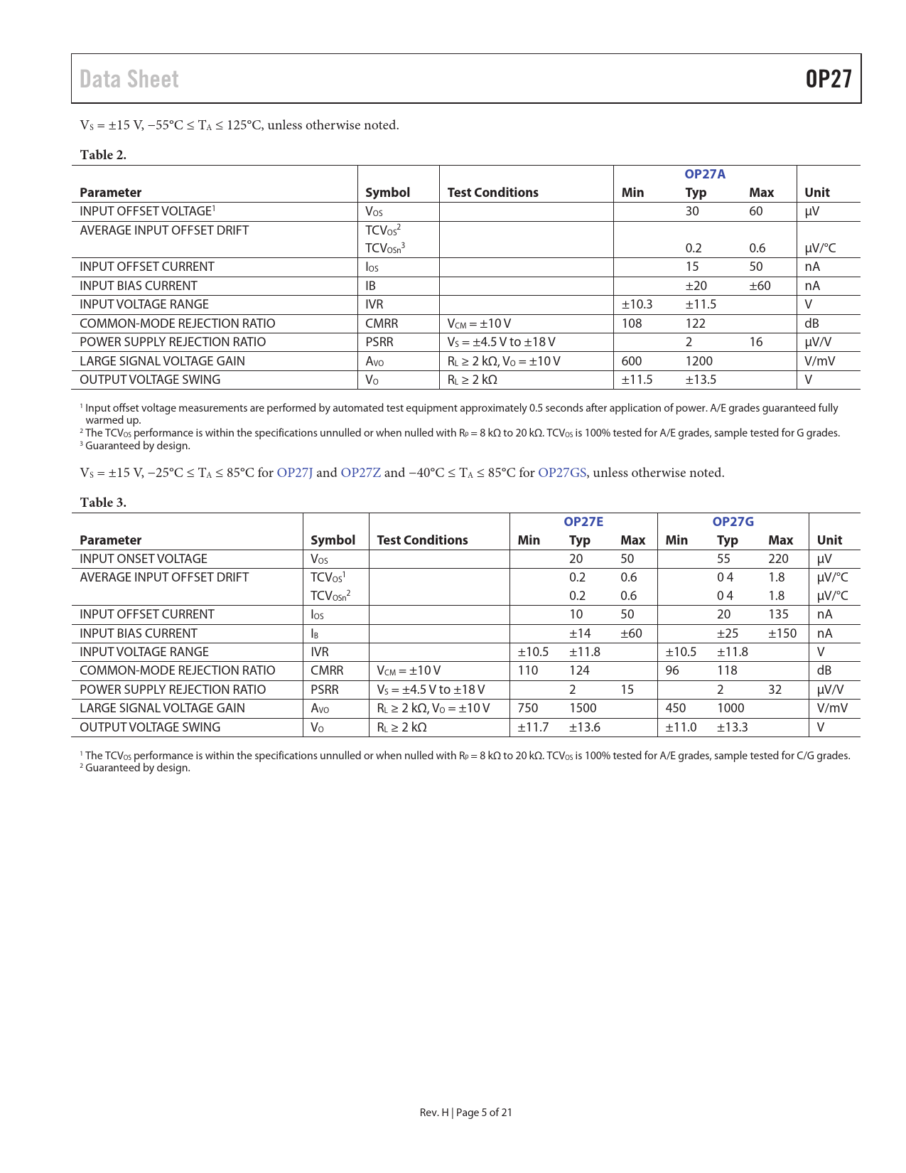 Table 2. OP27A. Parameter. Symbol. Test Conditions. Min. Typ. Max. Unit. Table 3. OP27E. OP27G