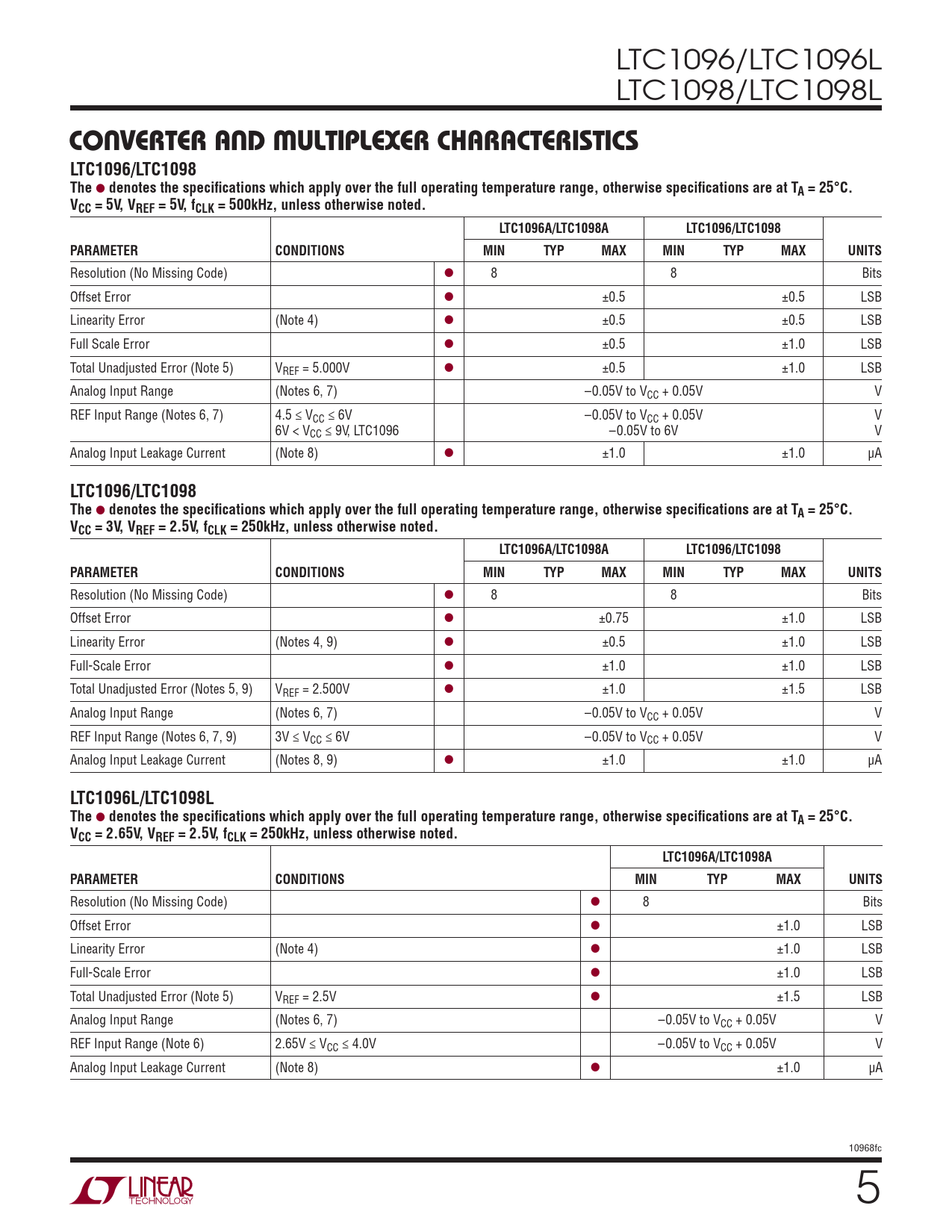 denotes the specifi cations which apply over the full operating temperature range, otherwise specifi cations are at TA = 25°C. VCC = 5V, VREF = 5V, fCLK = 500kHz, unless otherwise noted. LTC1096A/LTC1098A LTC1096/LTC1098 PARAMETER CONDITIONS MIN TYP MAX MIN TYP MAX UNITS