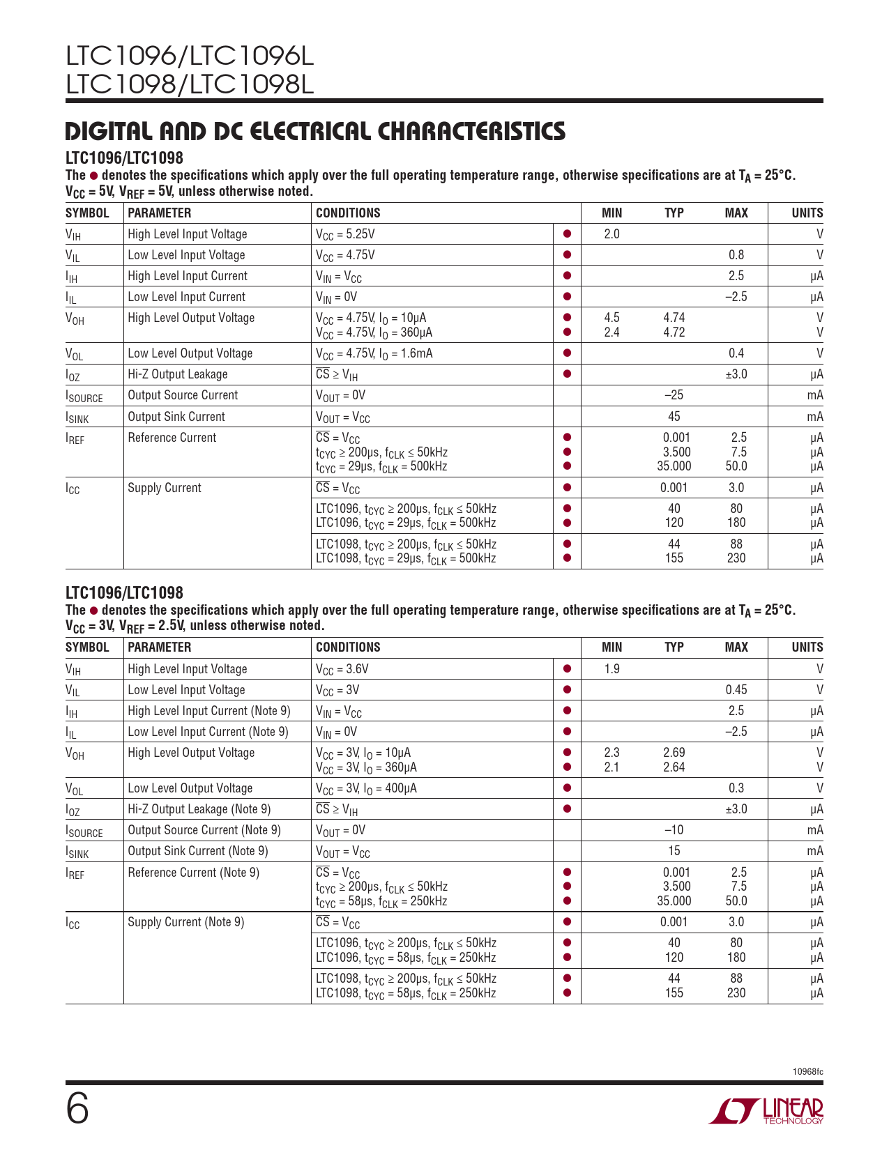 VIH High Level Input Voltage VCC = 3.6V l 1.9 V VIL Low Level Input Voltage VCC = 3V l 0.45 V IIH High Level Input Current (Note 9) VIN = VCC l 2.5 μA IIL Low Level Input Current (Note 9) VIN = 0V l –2.5 μA VOH High Level Output Voltage VCC = 3V, IO = 10μA l 2.3 2.69 V VCC = 3V, IO = 360μA l 2.1 2.64 V VOL Low Level Output Voltage VCC = 3V, IO = 400μA l 0.3 V IOZ Hi-Z Output Leakage (Note 9) CS ≥ VIH l ±3.0 μA ISOURCE Output Source Current (Note 9) VOUT = 0V –10 mA ISINK Output Sink Current (Note 9) VOUT = VCC 15 mA IREF Reference Current (Note 9) CS = VCC l 0.001 2.5 μA tCYC ≥ 200μs, fCLK ≤ 50kHz l 3.500 7.5 μA tCYC = 58μs, fCLK = 250kHz l 35.000 50.0 μA ICC Supply Current (Note 9) CS = VCC l 0.001 3.0 μA LTC1096, tCYC ≥ 200μs, fCLK ≤ 50kHz l 40 80 μA LTC1096, tCYC = 58μs, fCLK = 250kHz l 120 180 μA LTC1098, tCYC ≥ 200μs, fCLK ≤ 50kHz l 44 88 μA LTC1098, tCYC = 58μs, fCLK = 250kHz l 155 230 μA 10968fc 6