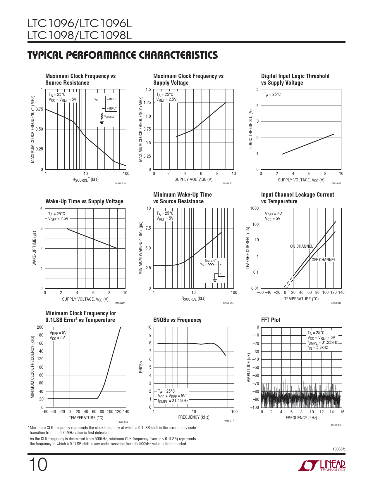 LTC1096/LTC1096L LTC1098/LTC1098L TYPICAL PERFORMANCE CHARACTERISTICSMaximum Clock Frequency vsMaximum Clock Frequency vsDigital Input Logic ThresholdSource ResistanceSupply Voltagevs Supply Voltage 1 1.5 5 TA = 25°C TA = 25°C TA = 25°C V + INPUT V IN CC = VREF = 5V VREF = 2.5V 1.25 4 0.75 – INPUT R – SOURCE 1.0 3 0.50 0.75 2 0.5 0.25 LOGIC THRESH0LD (V) 1 0.25 MAXIMUM CLOCK FREQUENCY* (MHz) MAXIMUM CLOCK FREQUENCY (MHz) 0 0 0 1 10 100 0 2 4 6 8 10 0 2 4 6 8 10 R – SOURCE (kΩ) SUPPLY VOLTAGE (V) SUPPLY VOLTAGE, VCC (V) 10968 G10 10968 G11 10968 G12 Minimum Wake-Up TimeInput Channel Leakage CurrentWake-Up Time vs Supply Voltagevs Source Resistancevs Temperature 4 10 1000 TA = 25°C TA = 25°C VREF = 5V VREF = 2.5V VREF = 5V VCC = 5V 100 3 7.5 10 ON CHANNEL 2 5.0 1 R + OFF CHANNEL SOURCE WAKE-UP TIME (μs) V + IN 1 2.5 LEAKAGE CURRENT (nA) MINIMUM WAKE-UP TIME (μs) – 0.1 0 0 0.01 0 2 4 6 8 10 1 10 100 –60 –40 –20 0 20 40 60 80 100 120 140 SUPPLY VOLTAGE, V R CC (V) SOURCE (kΩ) TEMPERATURE (°C) 10968 G13 10968 G14 10968 G15 Minimum Clock Frequency for 0.1LSB Error† vs TemperatureENOBs vs FrequencyFFT Plot 200 10 0 VREF = 5V T 180 9 –10 A = 25°C VCC = 5V VCC = VREF = 5V 160 8 –20 fSMPL = 31.25kHz fIN = 5.8kHz 140 7 –30 120 6 –40 100 5 –50 ENOBs 80 4 –60 AMPLITUDE (dB) 60 3 –70 40 2 TA = 25°C –80 MINIMUM CLOCK FREQUENCY (kHz) V 20 CC = VREF = 5V 1 f –90 SMPL = 31.25kHz 0 0 –100 –60 –40 –20 0 20 40 60 80 100 120 140 1 10 100 0 2 4 6 8 10 12 14 16 TEMPERATURE (°C) FREQUENCY (kHz) FREQUENCY (kHz) 10968 G16 10968 G17 10968 G18 * Maximum CLK frequency represents the clock frequency at which a 0.1LSB shift in the error at any code transition from its 0.75MHz value is fi rst detected. † As the CLK frequency is decreased from 500kHz, minimum CLK frequency (Δerror ≤ 0.1LSB) represents the frequency at which a 0.1LSB shift in any code transition from its 500kHz value is fi rst detected. 10968fc 10