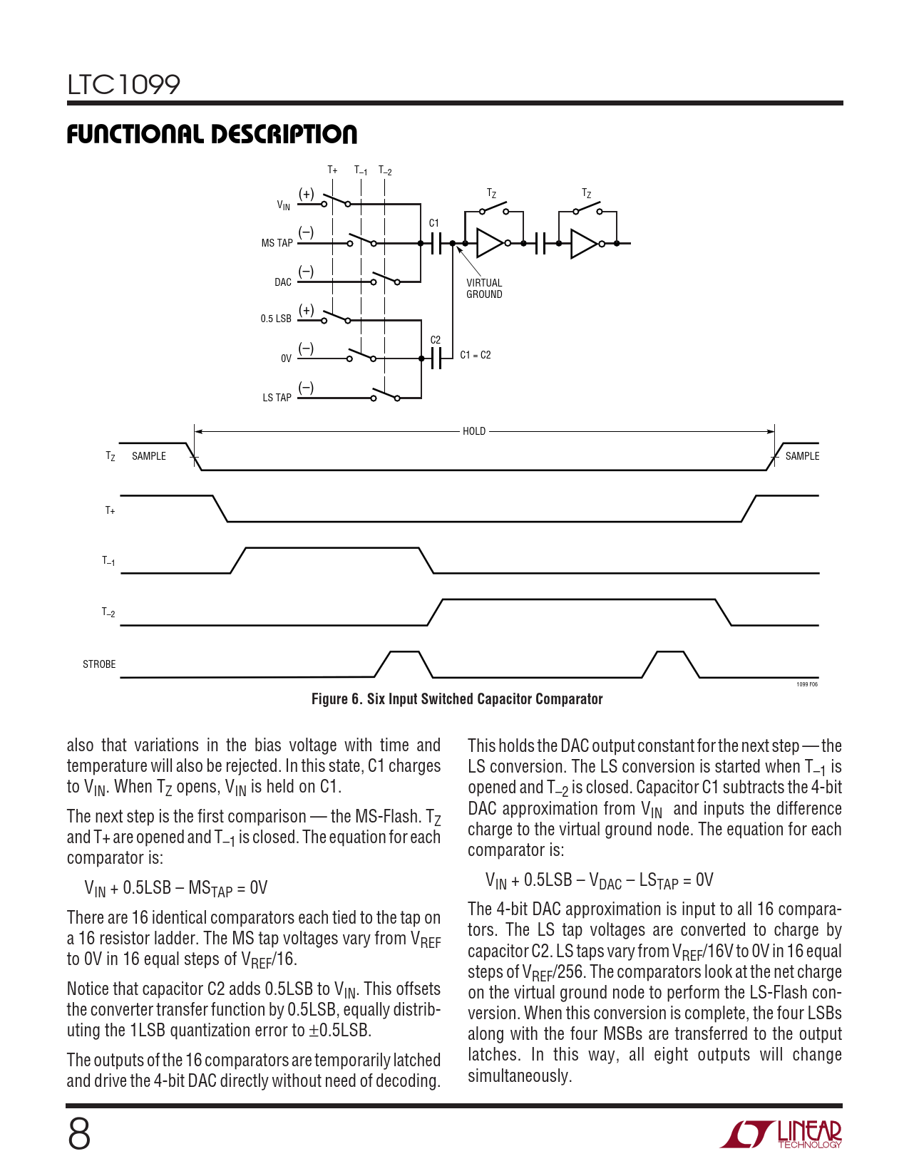 T+ T–1 T–2 T T (+) Z Z VIN C1 (–) MS TAP (–) DAC VIRTUAL GROUND (+) 0.5 LSB C2 (–) 0V C1 = C2 (–) LS TAP HOLD TZ SAMPLE SAMPLE T+ T–1 T–2 STROBE 1099 F06