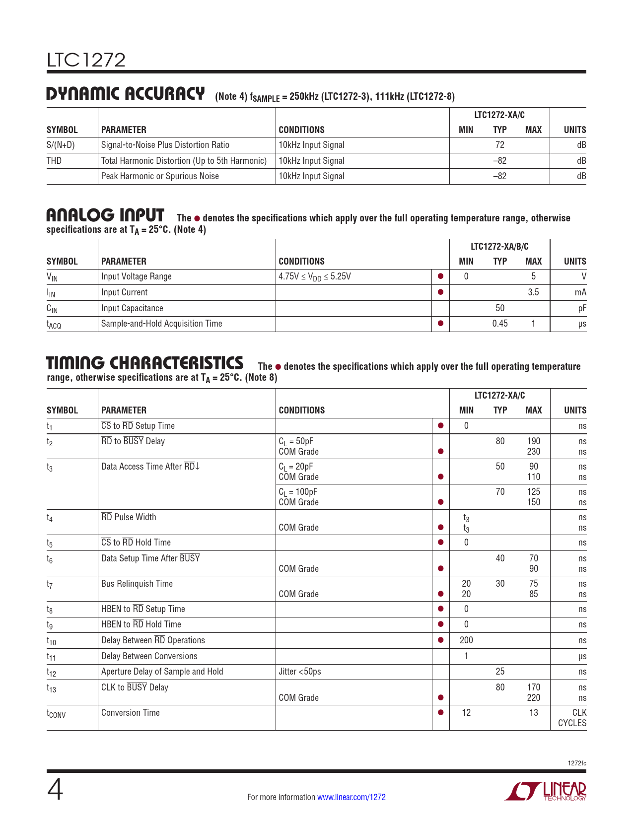 LTC1272 DYNAMIC ACCURACY (Note 4) fSAMPLE = 250kHz (LTC1272-3), 111kHz (LTC1272-8)LTC1272-XA/CSYMBOLPARAMETERCONDITIONSMINTYPMAXUNITS S/(N+D) Signal-to-Noise Plus Distortion Ratio 10kHz Input Signal 72 dB THD Total Harmonic Distortion (Up to 5th Harmonic) 10kHz Input Signal –82 dB Peak Harmonic or Spurious Noise 10kHz Input Signal –82 dB ANALOG INPUTThe l denotes the specifications which apply over the full operating temperature range, otherwisespecifications are at TA = 25°C. (Note 4)LTC1272-XA/B/CSYMBOLPARAMETERCONDITIONSMINTYPMAXUNITS VIN Input Voltage Range 4.75V ≤ VDD ≤ 5.25V l 0 5 V IIN Input Current l 3.5 mA CIN Input Capacitance 50 pF tACQ Sample-and-Hold Acquisition Time l 0.45 1 µs TIMING CHARACTERISTICSThe l denotes the specifications which apply over the full operating temperaturerange, otherwise specifications are at TA = 25°C. (Note 8)LTC1272-XA/CSYMBOLPARAMETERCONDITIONSMINTYPMAXUNITS t1 CS to RD Setup Time l 0 ns t2 RD to BUSY Delay CL = 50pF 80 190 ns COM Grade l 230 ns t3 Data Access Time After RD↓ CL = 20pF 50 90 ns COM Grade l 110 ns CL = 100pF 70 125 ns COM Grade l 150 ns t4 RD Pulse Width t3 ns COM Grade l t3 ns t5 CS to RD Hold Time l 0 ns t6 Data Setup Time After BUSY 40 70 ns COM Grade l 90 ns t7 Bus Relinquish Time 20 30 75 ns COM Grade l 20 85 ns t8 HBEN to RD Setup Time l 0 ns t9 HBEN to RD Hold Time l 0 ns t10 Delay Between RD Operations l 200 ns t11 Delay Between Conversions 1 µs t12 Aperture Delay of Sample and Hold Jitter <50ps 25 ns t13 CLK to BUSY Delay 80 170 ns COM Grade l 220 ns tCONV Conversion Time l 12 13 CLK CYCLES 1272fc 4 For more information www.linear.com/1272 Document Outline FEATURES APPLICATIONS DESCRIPTION TYPICAL APPLICATION ABSOLUTE MAXIMUM RATINGS PIN CONFIGURATION ORDER INFORMATION CONVERTER CHARACTERISTICS INTERNAL REFERENCE CHARACTERISTICS DIGITAL AND DC ELECTRICAL CHARACTERISTICS DYNAMIC ACCURACY ANALOG INPUT TIMING CHARACTERISTICS PIN FUNCTIONS TYPICAL PERFORMANCE CHARACTERISTICS APPLICATIONS INFORMATION REVISION HISTORY PACKAGE DESCRIPTION