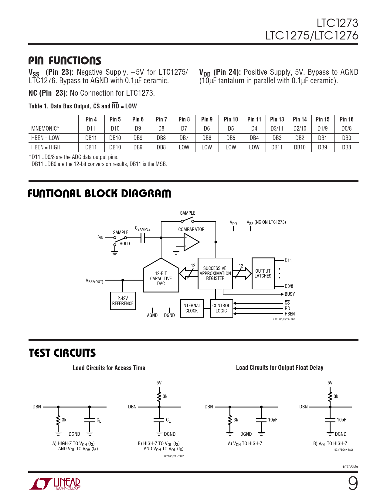 5V 5V 3k 3k DBN DBN DBN DBN 3k CL CL 3k 10pF 10pF DGND DGND DGND DGND A) HIGH-Z TO VOH (t3) B) HIGH-Z TO VOL (t3) A) VOH TO HIGH-Z B) VOL TO HIGH-Z AND VOL TO VOH (t6) AND VOH TO VOL (t6) 1273/75/76 • TA08 1273/75/76 • TA07 127356fa 9