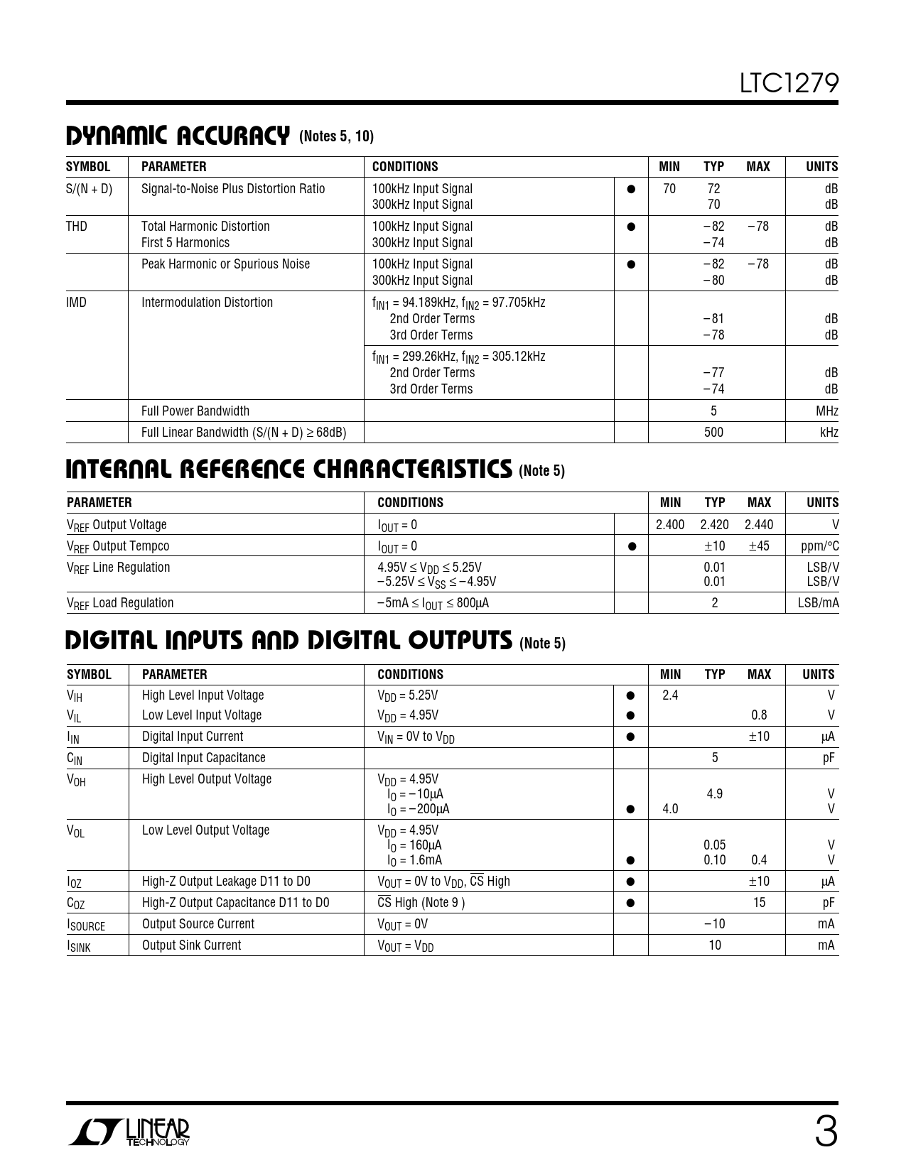 LTC1279 UWDY A IC ACCURACY (Notes 5, 10)SYMBOLPARAMETERCONDITIONSMINTYPMAXUNITS S/(N + D) Signal-to-Noise Plus Distortion Ratio 100kHz Input Signal ● 70 72 dB 300kHz Input Signal 70 dB THD Total Harmonic Distortion 100kHz Input Signal ● – 82 – 78 dB First 5 Harmonics 300kHz Input Signal – 74 dB Peak Harmonic or Spurious Noise 100kHz Input Signal ● – 82 – 78 dB 300kHz Input Signal – 80 dB IMD Intermodulation Distortion fIN1 = 94.189kHz, fIN2 = 97.705kHz 2nd Order Terms – 81 dB 3rd Order Terms – 78 dB fIN1 = 299.26kHz, fIN2 = 305.12kHz 2nd Order Terms – 77 dB 3rd Order Terms – 74 dB Full Power Bandwidth 5 MHz Full Linear Bandwidth (S/(N + D) ≥ 68dB) 500 kHz UUUI TER AL REFERE CE CHARACTERISTICS (Note 5)PARAMETERCONDITIONSMINTYPMAXUNITS VREF Output Voltage IOUT = 0 2.400 2.420 2.440 V VREF Output Tempco IOUT = 0 ● ±10 ±45 ppm/°C VREF Line Regulation 4.95V ≤ VDD ≤ 5.25V 0.01 LSB/V – 5.25V ≤ VSS ≤ – 4.95V 0.01 LSB/V VREF Load Regulation – 5mA ≤ IOUT ≤ 800µA 2 LSB/mA UUDIGITAL I PUTS A D DIGITAL OUTPUTS (Note 5)SYMBOLPARAMETERCONDITIONSMINTYPMAXUNITS VIH High Level Input Voltage VDD = 5.25V ● 2.4 V VIL Low Level Input Voltage VDD = 4.95V ● 0.8 V IIN Digital Input Current VIN = 0V to VDD ● ±10 µA CIN Digital Input Capacitance 5 pF VOH High Level Output Voltage VDD = 4.95V IO = – 10µA 4.9 V IO = – 200µA ● 4.0 V VOL Low Level Output Voltage VDD = 4.95V IO = 160µA 0.05 V IO = 1.6mA ● 0.10 0.4 V IOZ High-Z Output Leakage D11 to D0 VOUT = 0V to VDD, CS High ● ±10 µA COZ High-Z Output Capacitance D11 to D0 CS High (Note 9 ) ● 15 pF ISOURCE Output Source Current VOUT = 0V – 10 mA ISINK Output Sink Current VOUT = VDD 10 mA 3