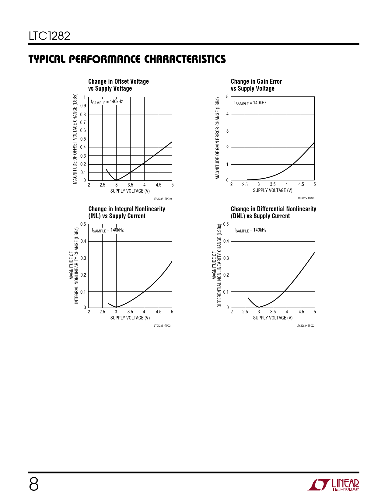 1 5 fSAMPLE = 140kHz fSAMPLE = 140kHz 0.9 0.8 4 0.7 0.6 3 0.5 0.4 2 0.3 0.2 1 0.1 MAGNITUDE OF GAIN ERROR CHANGE (LSBs) 0 0 MAGNITUDE OF OFFSET VOLTAGE CHANGE (LSBs) 2 2.5 3 3.5 4 4.5 5 2 2.5 3 3.5 4 4.5 5 SUPPLY VOLTAGE (V) SUPPLY VOLTAGE (V) LTC1282 • TPC19 LTC1282 • TPC20