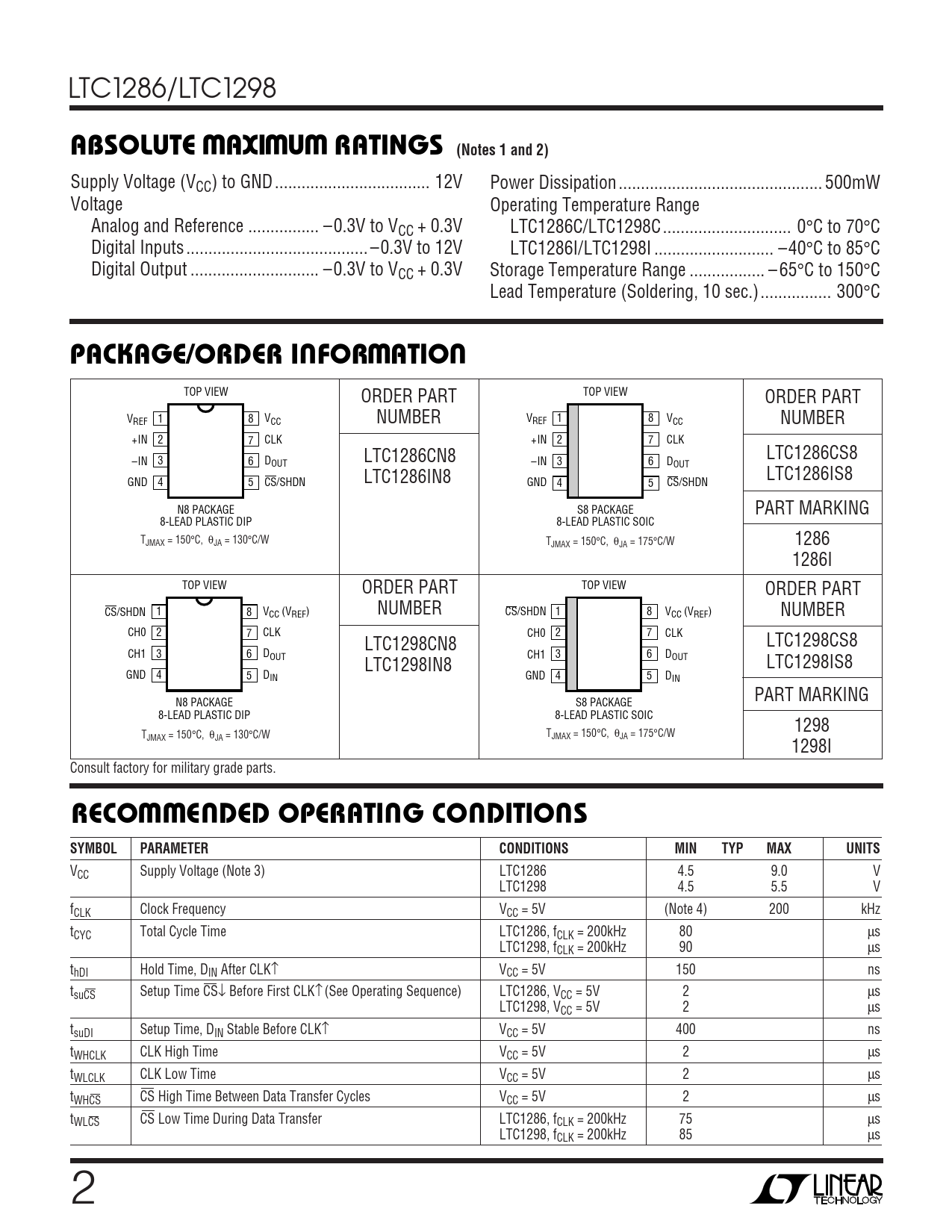 Supply Voltage (VCC) to GND... 12V Power Dissipation .. 500mW Voltage Operating Temperature Range Analog and Reference .. –0.3V to VCC + 0.3V LTC1286C/LTC1298C ... 0°C to 70°C Digital Inputs ... –0.3V to 12V LTC1286I/LTC1298I ... –40°C to 85°C Digital Output ... –0.3V to VCC + 0.3V Storage Temperature Range ... – 65°C to 150°C Lead Temperature (Soldering, 10 sec.).. 300°C