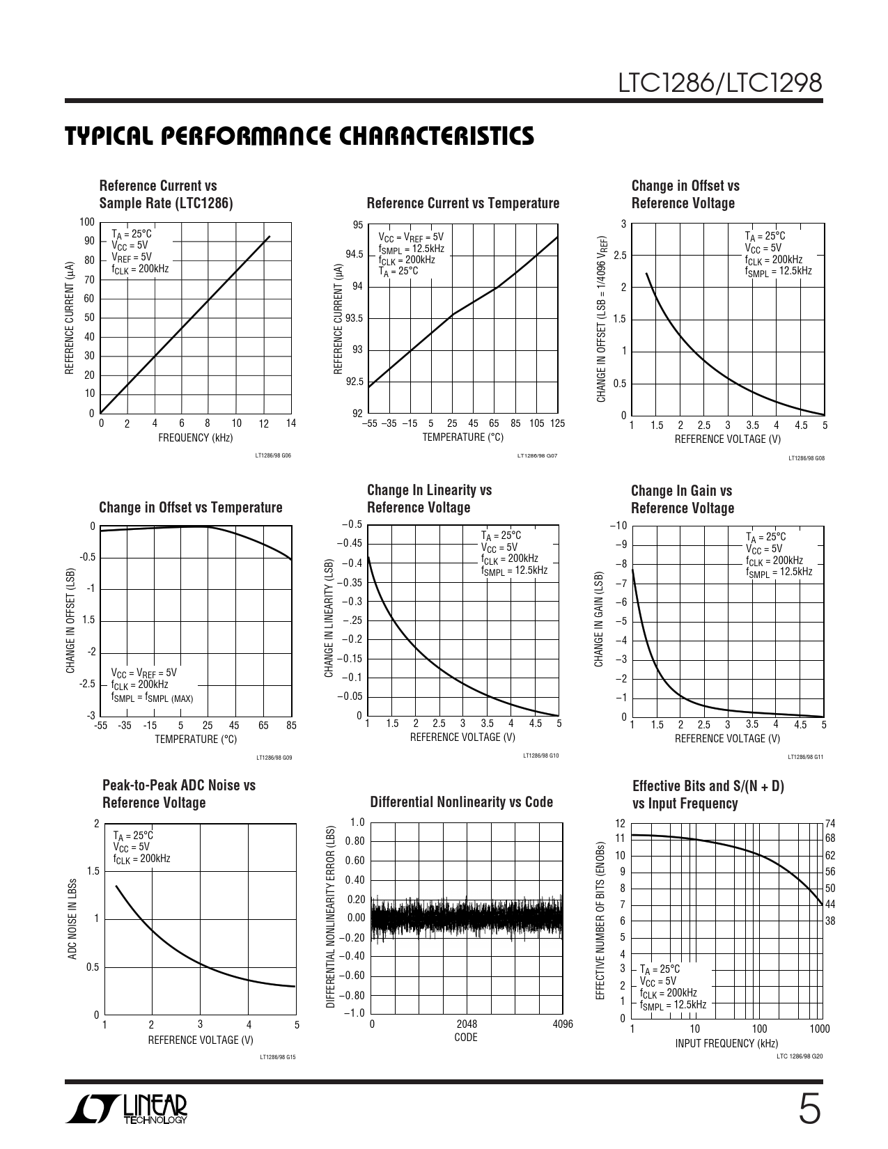 2 1.0 12 74 TA = 25°C 11 68 0.80 VCC = 5V 10 62 fCLK = 200kHz 0.60 1.5 9 56 0.40 8 50 0.20 7 44 1 0.00 6 38 –0.20 5 ADC NOISE IN LBSs –0.40 4 0.5 3 TA = 25°C –0.60 V 2 CC = 5V –0.80 EFFECTIVE NUMBER OF BITS (ENOBs) fCLK = 200kHz 1 DIFFERENTIAL NONLINEARITY ERROR (LBS) fSMPL = 12.5kHz 0 –1.0 0 1 2 3 4 5 0 2048 4096 1 10 100 1000 REFERENCE VOLTAGE (V) CODE INPUT FREQUENCY (kHz) LT1286/98 G15 LTC 1286/98 G20 5