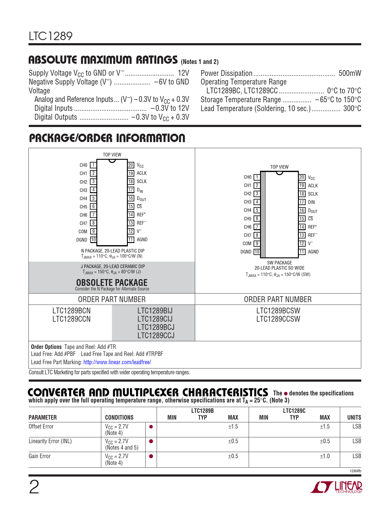 LTC1289 WWWUABSOLUTEAXI UAR TI GS (Notes 1 and 2) Supply Voltage VCC to GND or V – ... 12V Power Dissipation ... 500mW Negative Supply Voltage (V–) .. – 6V to GND Operating Temperature Range Voltage LTC1289BC, LTC1289CC ... 0°C to 70°C Analog and Reference Inputs... (V–) – 0.3V to VCC + 0.3V Storage Temperature Range .. – 65°C to 150°C Digital Inputs .. – 0.3V to 12V Lead Temperature (Soldering, 10 sec.).. 300°C Digital Outputs ... – 0.3V to VCC + 0.3V UWUPACKAGE/ORDER I FOR ATIO TOP VIEW CH0 1 20 VCC TOP VIEW CH1 2 19 ACLK CH0 1 20 VCC CH2 3 18 SCLK CH1 2 19 ACLK CH3 4 17 DIN CH2 3 18 SCLK CH4 5 16 DOUT CH3 4 17 DIN CH5 6 15 CS CH4 5 16 DOUT CH6 7 14 REF+ CH5 6 15 CS CH7 8 13 REF– CH6 7 14 REF+ COM 9 12 V– CH7 8 13 REF– DGND 10 11 AGND COM 9 12 V– N PACKAGE, 20-LEAD PLASTIC DIP DGND 10 11 AGND TJMAX = 110°C, θJA = 100°C/W (N) SW PACKAGE J PACKAGE, 20-LEAD CERAMIC DIP 20-LEAD PLASTIC SO WIDE TJMAX = 150°C, θJA = 80°C/W (J) TJMAX = 110°C, θJA = 150°C/W (SW) OBSOLETE PACKAGE Consider the N Package for Alternate Source ORDER PART NUMBER ORDER PART NUMBER LTC1289BCN LTC1289BIJ LTC1289BCSW LTC1289CCN LTC1289CIJ LTC1289CCSW LTC1289BCJ LTC1289CCJ Order Options Tape and Reel: Add #TR Lead Free: Add #PBF Lead Free Tape and Reel: Add #TRPBF Lead Free Part Marking: http://www.linear.com/leadfree/ Consult LTC Marketing for parts specified with wider operating temperature ranges. UU WCO VERTER A D ULTIPLEXER CHARACTERISTICS The ● denotes the specificationswhich apply over the full operating temperature range, otherwise specifications are at TA = 25 ° C. (Note 3)LTC1289BLTC1289CPARAMETERCONDITIONSMINTYPMAXMINTYPMAXUNITS Offset Error VCC = 2.7V ● ±1.5 ±1.5 LSB (Note 4) Linearity Error (INL) VCC = 2.7V ● ±0.5 ±0.5 LSB (Notes 4 and 5) Gain Error VCC = 2.7V ● ±0.5 ±1.0 LSB (Note 4) 1289fb 2