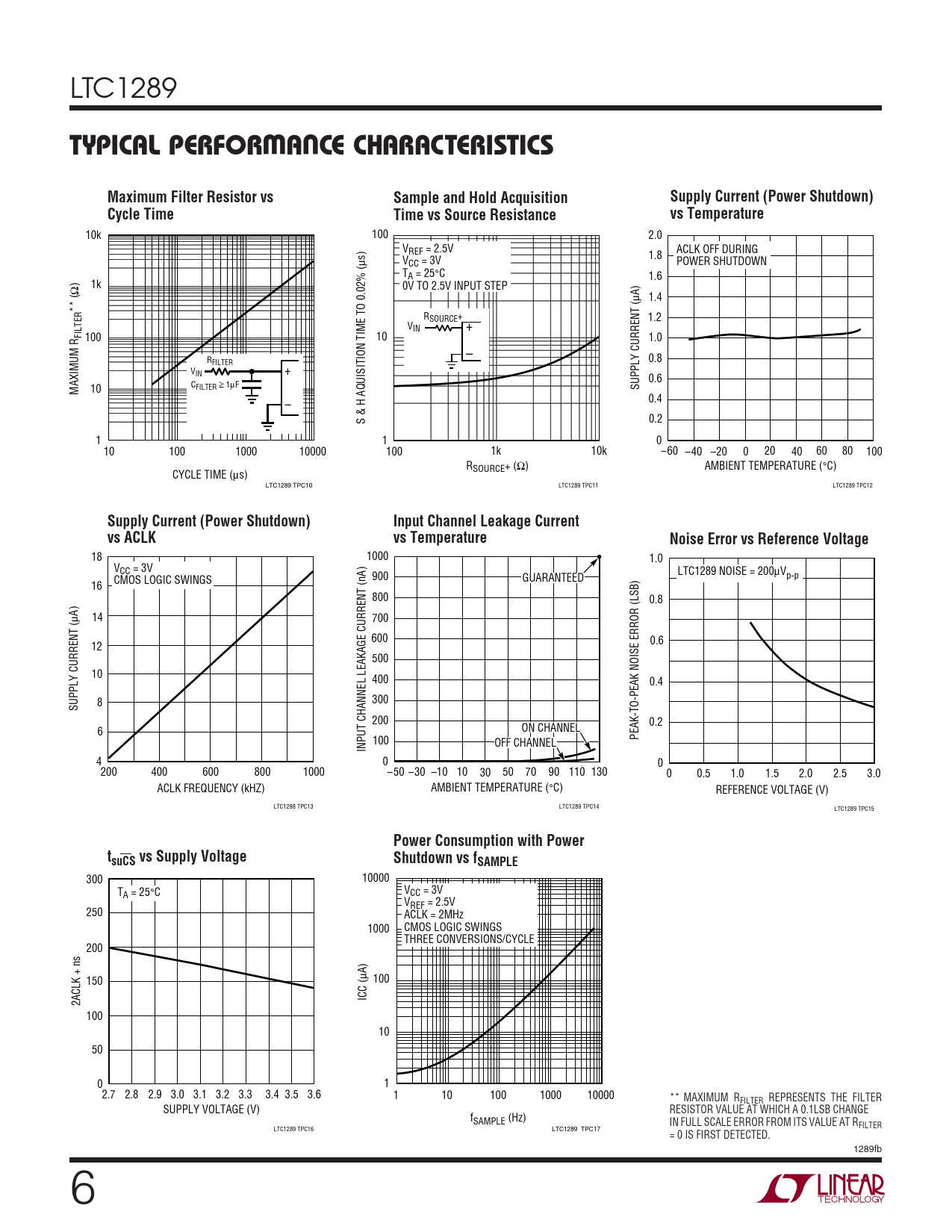 300 10000 T V A = 25°C CC = 3V VREF = 2.5V 250 ACLK = 2MHz 1000 CMOS LOGIC SWINGS THREE CONVERSIONS/CYCLE 200 + ns µA) 150 100 ICC ( 2ACLK 100 10 50 0 1 2.7 2.8 2.9 3.0 3.1 3.2 3.3 3.4 3.5 3.6 1 10 100 1000 10000 ** MAXIMUM RFILTER REPRESENTS THE FILTER SUPPLY VOLTAGE (V) RESISTOR VALUE AT WHICH A 0.1LSB CHANGE fSAMPLE (Hz) IN FULL SCALE ERROR FROM ITS VALUE AT RFILTER LTC1289 TPC16 LTC1289 TPC17 = 0 IS FIRST DETECTED. 1289fb 6
