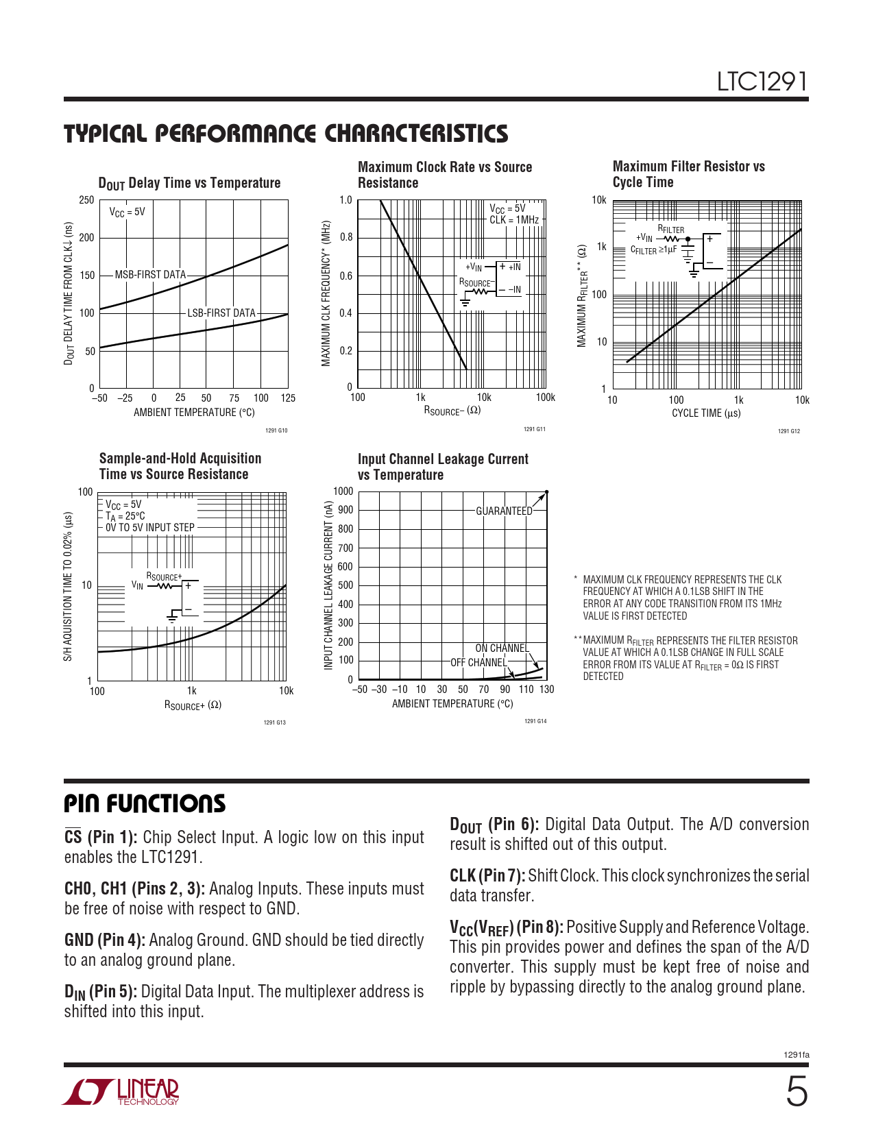 100 1000 VCC = 5V 900 GUARANTEED µs) TA = 25°C 0V TO 5V INPUT STEP 800 700 600 RSOURCE+ * MAXIMUM CLK FREQUENCY REPRESENTS THE CLK 10 VIN + 500 FREQUENCY AT WHICH A 0.1LSB SHIFT IN THE 400 ERROR AT ANY CODE TRANSITION FROM ITS 1MHz – VALUE IS FIRST DETECTED 300 200 **MAXIMUM RFILTER REPRESENTS THE FILTER RESISTOR ON CHANNEL VALUE AT WHICH A 0.1LSB CHANGE IN FULL SCALE S/H AQUISITION TIME TO 0.02% ( 100 INPUT CHANNEL LEAKAGE CURRENT (nA) OFF CHANNEL ERROR FROM ITS VALUE AT RFILTER = 0Ω IS FIRST 1 0 DETECTED 100 1k 10k –50 –30 –10 10 30 50 70 90 110 130 R AMBIENT TEMPERATURE (°C) SOURCE+ (Ω) 1291 G13 1291 G14
