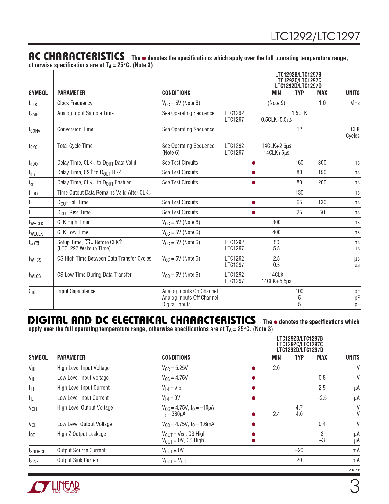 C. (Note 3) LTC1292B/LTC1297B LTC1292C/LTC1297C LTC1292D/LTC1297D SYMBOL PARAMETER CONDITIONS MIN TYP MAX UNITS