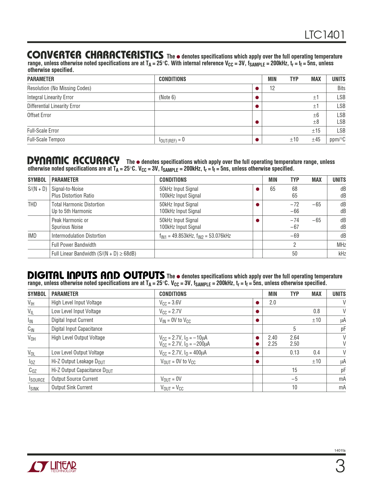 LTC1401 UCO VERTER CHCARA TERISTICS The ● denotes specifications which apply over the full operating temperaturerange, unless otherwise noted specifications are at TA = 25 ° C. With internal reference VCC = 3V, fSAMPLE = 200kHz, tr = tf = 5ns, unlessotherwise specified.PARAMETERCONDITIONSMINTYPMAXUNITS Resolution (No Missing Codes) ● 12 Bits Integral Linearity Error (Note 6) ● ±1 LSB Differential Linearity Error ● ±1 LSB Offset Error ±6 LSB ● ±8 LSB Full-Scale Error ±15 LSB Full-Scale Tempco IOUT(REF) = 0 ● ±10 ±45 ppm/°C UWDY A IC ACCURACY The ● denotes specifications which apply over the full operating temperature range, unlessotherwise noted specifications are at TA = 25 ° C. VCC = 3V, fSAMPLE = 200kHz, tr = tf = 5ns, unless otherwise specified.SYMBOLPARAMETERCONDITIONSMINTYPMAXUNITS S/(N + D) Signal-to-Noise 50kHz Input Signal ● 65 68 dB Plus Distortion Ratio 100kHz Input Signal 65 dB THD Total Harmonic Distortion 50kHz Input Signal ● – 72 – 65 dB Up to 5th Harmonic 100kHz Input Signal – 66 dB Peak Harmonic or 50kHz Input Signal ● – 74 – 65 dB Spurious Noise 100kHz Input Signal – 67 dB IMD Intermodulation Distortion fIN1 = 49.853kHz, fIN2 = 53.076kHz – 69 dB Full Power Bandwidth 2 MHz Full Linear Bandwidth (S/(N + D) ≥ 68dB) 50 kHz UUDIGITAL I PUTS AND OUTPUTS The ● denotes specifications which apply over the full operating temperaturerange, unless otherwise noted specifications are at TA = 25 ° C. VCC = 3V, fSAMPLE = 200kHz, tr = tf = 5ns, unless otherwise specified.SYMBOLPARAMETERCONDITIONSMINTYPMAXUNITS VIH High Level Input Voltage VCC = 3.6V ● 2.0 V VIL Low Level Input Voltage VCC = 2.7V ● 0.8 V IIN Digital Input Current VIN = 0V to VCC ● ±10 µA CIN Digital Input Capacitance 5 pF VOH High Level Output Voltage VCC = 2.7V, IO = – 10µA ● 2.40 2.64 V VCC = 2.7V, IO = – 200µA ● 2.25 2.50 V VOL Low Level Output Voltage VCC = 2.7V, IO = 400µA ● 0.13 0.4 V IOZ Hi-Z Output Leakage DOUT VOUT = 0V to VCC ● ±10 µA COZ Hi-Z Output Capacitance DOUT 15 pF ISOURCE Output Source Current VOUT = 0V – 5 mA ISINK Output Sink Current VOUT = VCC 10 mA 1401fa 3