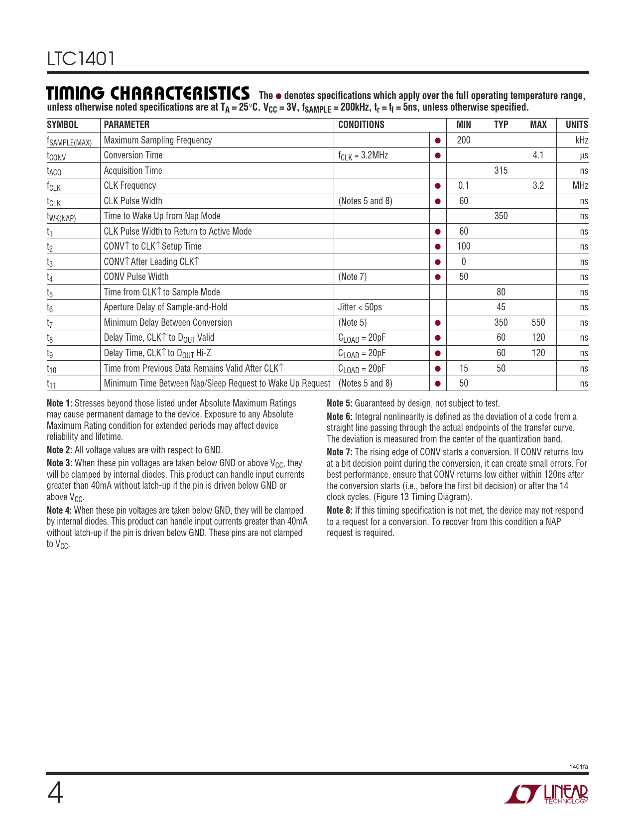 LTC1401 W UTI I G CHARACTERISTICS The ● denotes specifications which apply over the full operating temperature range,unless otherwise noted specifications are at TA = 25 ° C. VCC = 3V, fSAMPLE = 200kHz, tr = tf = 5ns, unless otherwise specified.SYMBOLPARAMETERCONDITIONSMINTYPMAXUNITS fSAMPLE(MAX) Maximum Sampling Frequency ● 200 kHz tCONV Conversion Time fCLK = 3.2MHz ● 4.1 µs tACQ Acquisition Time 315 ns fCLK CLK Frequency ● 0.1 3.2 MHz tCLK CLK Pulse Width (Notes 5 and 8) ● 60 ns tWK(NAP) Time to Wake Up from Nap Mode 350 ns t1 CLK Pulse Width to Return to Active Mode ● 60 ns t2 CONV↑ to CLK↑ Setup Time ● 100 ns t3 CONV↑ After Leading CLK↑ ● 0 ns t4 CONV Pulse Width (Note 7) ● 50 ns t5 Time from CLK↑ to Sample Mode 80 ns t6 Aperture Delay of Sample-and-Hold Jitter < 50ps 45 ns t7 Minimum Delay Between Conversion (Note 5) ● 350 550 ns t8 Delay Time, CLK↑ to DOUT Valid CLOAD = 20pF ● 60 120 ns t9 Delay Time, CLK↑ to DOUT Hi-Z CLOAD = 20pF ● 60 120 ns t10 Time from Previous Data Remains Valid After CLK↑ CLOAD = 20pF ● 15 50 ns t11 Minimum Time Between Nap/Sleep Request to Wake Up Request (Notes 5 and 8) ● 50 ns Note 1: Stresses beyond those listed under Absolute Maximum Ratings Note 5: Guaranteed by design, not subject to test. may cause permanent damage to the device. Exposure to any Absolute Note 6: Integral nonlinearity is defined as the deviation of a code from a Maximum Rating condition for extended periods may affect device straight line passing through the actual endpoints of the transfer curve. reliability and lifetime. The deviation is measured from the center of the quantization band. Note 2: All voltage values are with respect to GND. Note 7: The rising edge of CONV starts a conversion. If CONV returns low Note 3: When these pin voltages are taken below GND or above VCC, they at a bit decision point during the conversion, it can create small errors. For will be clamped by internal diodes. This product can handle input currents best performance, ensure that CONV returns low either within 120ns after greater than 40mA without latch-up if the pin is driven below GND or the conversion starts (i.e., before the first bit decision) or after the 14 above VCC. clock cycles. (Figure 13 Timing Diagram). Note 4: When these pin voltages are taken below GND, they will be clamped Note 8: If this timing specification is not met, the device may not respond by internal diodes. This product can handle input currents greater than 40mA to a request for a conversion. To recover from this condition a NAP without latch-up if the pin is driven below GND. These pins are not clamped request is required. to VCC. 1401fa 4