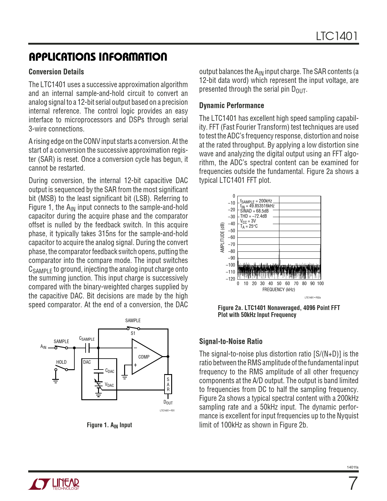 LTC1401 UUWUAPPLICATIONS INFORMATIONConversion Details output balances the AIN input charge. The SAR contents (a 12-bit data word) which represent the input voltage, are The LTC1401 uses a successive approximation algorithm presented through the serial pin D and an internal sample-and-hold circuit to convert an OUT. analog signal to a 12-bit serial output based on a precision Dynamic Performance internal reference. The control logic provides an easy interface to microprocessors and DSPs through serial The LTC1401 has excellent high speed sampling capabil- 3-wire connections. ity. FFT (Fast Fourier Transform) test techniques are used to test the ADC’s frequency response, distortion and noise A rising edge on the CONV input starts a conversion. At the at the rated throughput. By applying a low distortion sine start of a conversion the successive approximation regis- wave and analyzing the digital output using an FFT algo- ter (SAR) is reset. Once a conversion cycle has begun, it rithm, the ADC’s spectral content can be examined for cannot be restarted. frequencies outside the fundamental. Figure 2a shows a During conversion, the internal 12-bit capacitive DAC typical LTC1401 FFT plot. output is sequenced by the SAR from the most significant bit (MSB) to the least significant bit (LSB). Referring to 0 f –10 SAMPLE = 200kHz Figure 1, the A f IN input connects to the sample-and-hold IN = 49.853516kHz –20 SINAD = 68.5dB capacitor during the acquire phase and the comparator –30 THD = –72.4dB V offset is nulled by the feedback switch. In this acquire –40 CC = 3V TA = 25°C phase, it typically takes 315ns for the sample-and-hold –50 – 60 capacitor to acquire the analog signal. During the convert –70 phase, the comparator feedback switch opens, putting the AMPLITUDE (dB) –80 comparator into the compare mode. The input switches –90 –100 CSAMPLE to ground, injecting the analog input charge onto –110 the summing junction. This input charge is successively –120 compared with the binary-weighted charges supplied by 0 10 20 30 40 50 60 70 80 90 100 FREQUENCY (kHz) the capacitive DAC. Bit decisions are made by the high LTC1401 • F02a speed comparator. At the end of a conversion, the DAC Figure 2a. LTC1401 Nonaveraged, 4096 Point FFT Plot with 50kHz Input Frequency SAMPLE S1 CSAMPLE SAMPLE – Signal-to-Noise Ratio AIN The signal-to-noise plus distortion ratio [S/(N+D)] is the COMP HOLD DAC + ratio between the RMS amplitude of the fundamental input CDAC frequency to the RMS amplitude of all other frequency S components at the A/D output. The output is band limited VDAC A R to frequencies from DC to half the sampling frequency. Figure 2a shows a typical spectral content with a 200kHz DOUT sampling rate and a 50kHz input. The dynamic perfor- LTC1401 • F01 mance is excellent for input frequencies up to the Nyquist Figure 1. AIN Input limit of 100kHz as shown in Figure 2b. 1401fa 7