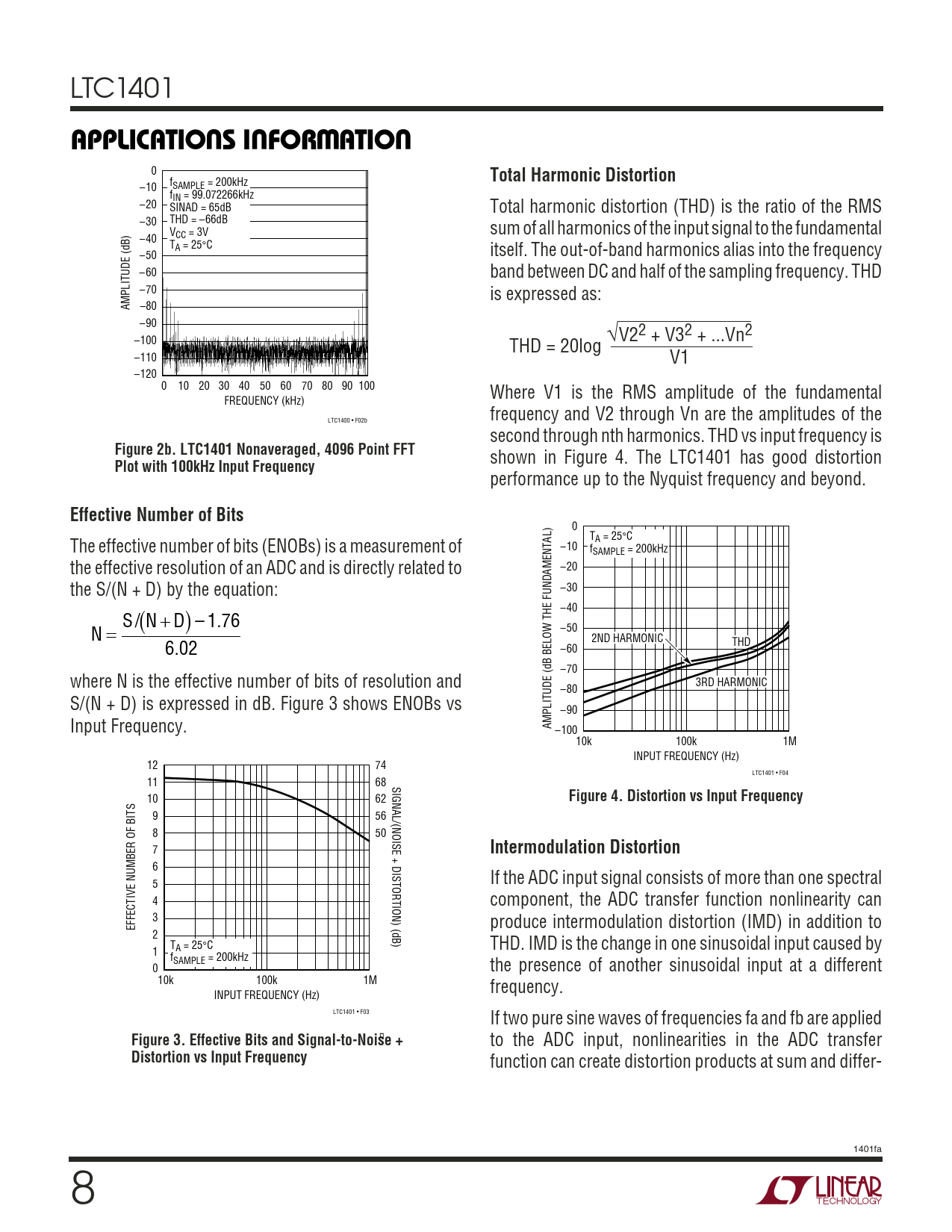 LTC1401 UUWUAPPLICATIONS INFORMATION 0 Total Harmonic Distortion f –10 SAMPLE = 200kHz fIN = 99.072266kHz –20 SINAD = 65dB Total harmonic distortion (THD) is the ratio of the RMS –30 THD = –66dB V sum of all harmonics of the input signal to the fundamental –40 CC = 3V TA = 25°C –50 itself. The out-of-band harmonics alias into the frequency – 60 band between DC and half of the sampling frequency. THD –70 is expressed as: AMPLITUDE (dB) –80 –90 –100 √V22 + V32 + ...Vn2 THD = 20log –110 V1 –120 0 10 20 30 40 50 60 70 80 90 100 Where V1 is the RMS amplitude of the fundamental FREQUENCY (kHz) LTC1400 • F02b frequency and V2 through Vn are the amplitudes of the second through nth harmonics. THD vs input frequency is Figure 2b. LTC1401 Nonaveraged, 4096 Point FFT shown in Figure 4. The LTC1401 has good distortion Plot with 100kHz Input Frequency performance up to the Nyquist frequency and beyond. Effective Number of Bits 0 TA = 25°C –10 The effective number of bits (ENOBs) is a measurement of fSAMPLE = 200kHz –20 the effective resolution of an ADC and is directly related to –30 the S/(N + D) by the equation: –40 S (/N + D) – 1.76 –50 N = 2ND HARMONIC THD –60 . 6 02 –70 where N is the effective number of bits of resolution and 3RD HARMONIC –80 S/(N + D) is expressed in dB. Figure 3 shows ENOBs vs –90 AMPLITUDE (dB BELOW THE FUNDAMENTAL) Input Frequency. –100 10k 100k 1M INPUT FREQUENCY (Hz) 12 74 LTC1401 • F04 11 68 SIGNAL/(NOISE + DISTORTION) (dB) 10 62 Figure 4. Distortion vs Input Frequency 9 56 8 50 7 Intermodulation Distortion 6 5 If the ADC input signal consists of more than one spectral 4 component, the ADC transfer function nonlinearity can 3 EFFECTIVE NUMBER OF BITS produce intermodulation distortion (IMD) in addition to 2 TA = 25°C THD. IMD is the change in one sinusoidal input caused by 1 fSAMPLE = 200kHz 0 the presence of another sinusoidal input at a different 10k 100k 1M frequency. INPUT FREQUENCY (Hz) LTC1401 • F03 If two pure sine waves of frequencies fa and fb are applied Figure 3. Effective Bits and Signal-to-Noise + to the ADC input, nonlinearities in the ADC transfer Distortion vs Input Frequency function can create distortion products at sum and differ- 1401fa 8