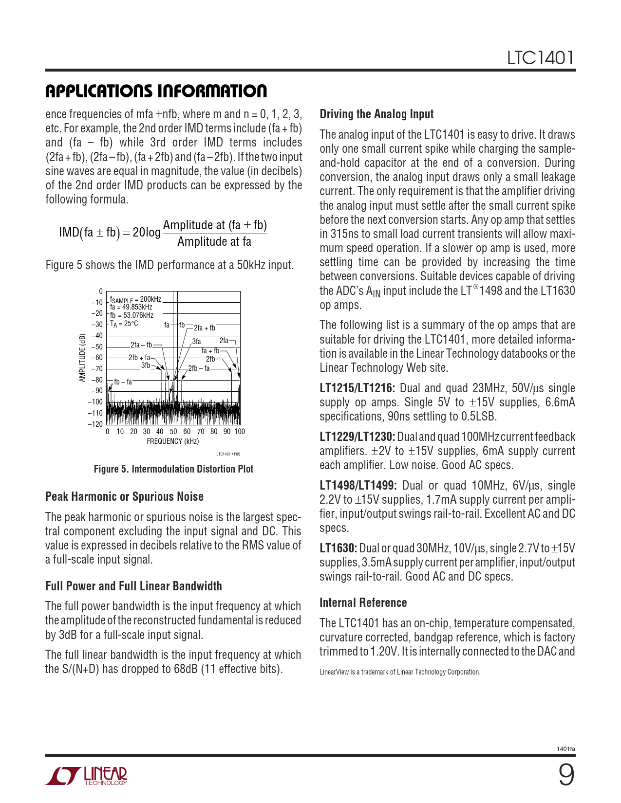 LTC1401 UUWUAPPLICATIONS INFORMATION ence frequencies of mfa ±nfb, where m and n = 0, 1, 2, 3, Driving the Analog Input etc. For example, the 2nd order IMD terms include (fa + fb) The analog input of the LTC1401 is easy to drive. It draws and (fa – fb) while 3rd order IMD terms includes only one small current spike while charging the sample- (2fa + fb), (2fa – fb), (fa + 2fb) and (fa – 2fb). If the two input and-hold capacitor at the end of a conversion. During sine waves are equal in magnitude, the value (in decibels) conversion, the analog input draws only a small leakage of the 2nd order IMD products can be expressed by the current. The only requirement is that the amplifier driving following formula. the analog input must settle after the small current spike before the next conversion starts. Any op amp that settles fa Amplitude at ( fb) IMD(fa ± fb) = ± 20log in 315ns to small load current transients will allow maxi- Amplitude at fa mum speed operation. If a slower op amp is used, more settling time can be provided by increasing the time Figure 5 shows the IMD performance at a 50kHz input. between conversions. Suitable devices capable of driving 0 the ADC’s AIN input include the LT ®1498 and the LT1630 f –10 SAMPLE = 200kHz fa = 49.853kHz op amps. –20 fb = 53.076kHz –30 TA = 25°C fa fb 2fa + fb The following list is a summary of the op amps that are –40 3fa 2fa suitable for driving the LTC1401, more detailed informa- –50 2fa – fb fa + fb tion is available in the Linear Technology databooks or the – 60 2fb + fa 2fb 3fb –70 2fb – fa Linear Technology Web site. AMPLITUDE (dB) –80 fb – fa –90 LT1215/LT1216: Dual and quad 23MHz, 50V/µs single –100 supply op amps. Single 5V to ±15V supplies, 6.6mA –110 specifications, 90ns settling to 0.5LSB. –120 0 10 20 30 40 50 60 70 80 90 100 LT1229/LT1230: Dual and quad 100MHz current feedback FREQUENCY (kHz) LTC1401 • F05 amplifiers. ±2V to ±15V supplies, 6mA supply current each amplifier. Low noise. Good AC specs. Figure 5. Intermodulation Distortion PlotLT1498/LT1499: Dual or quad 10MHz, 6V/µs, single Peak Harmonic or Spurious Noise 2.2V to ±15V supplies, 1.7mA supply current per ampli- fier, input/output swings rail-to-rail. Excellent AC and DC The peak harmonic or spurious noise is the largest spec- specs. tral component excluding the input signal and DC. This value is expressed in decibels relative to the RMS value of LT1630: Dual or quad 30MHz, 10V/µs, single 2.7V to ±15V a full-scale input signal. supplies, 3.5mA supply current per amplifier, input/output swings rail-to-rail. Good AC and DC specs. Full Power and Full Linear BandwidthInternal Reference The full power bandwidth is the input frequency at which the amplitude of the reconstructed fundamental is reduced The LTC1401 has an on-chip, temperature compensated, by 3dB for a full-scale input signal. curvature corrected, bandgap reference, which is factory trimmed to 1.20V. It is internally connected to the DAC and The full linear bandwidth is the input frequency at which the S/(N+D) has dropped to 68dB (11 effective bits). LinearView is a trademark of Linear Technology Corporation. 1401fa 9