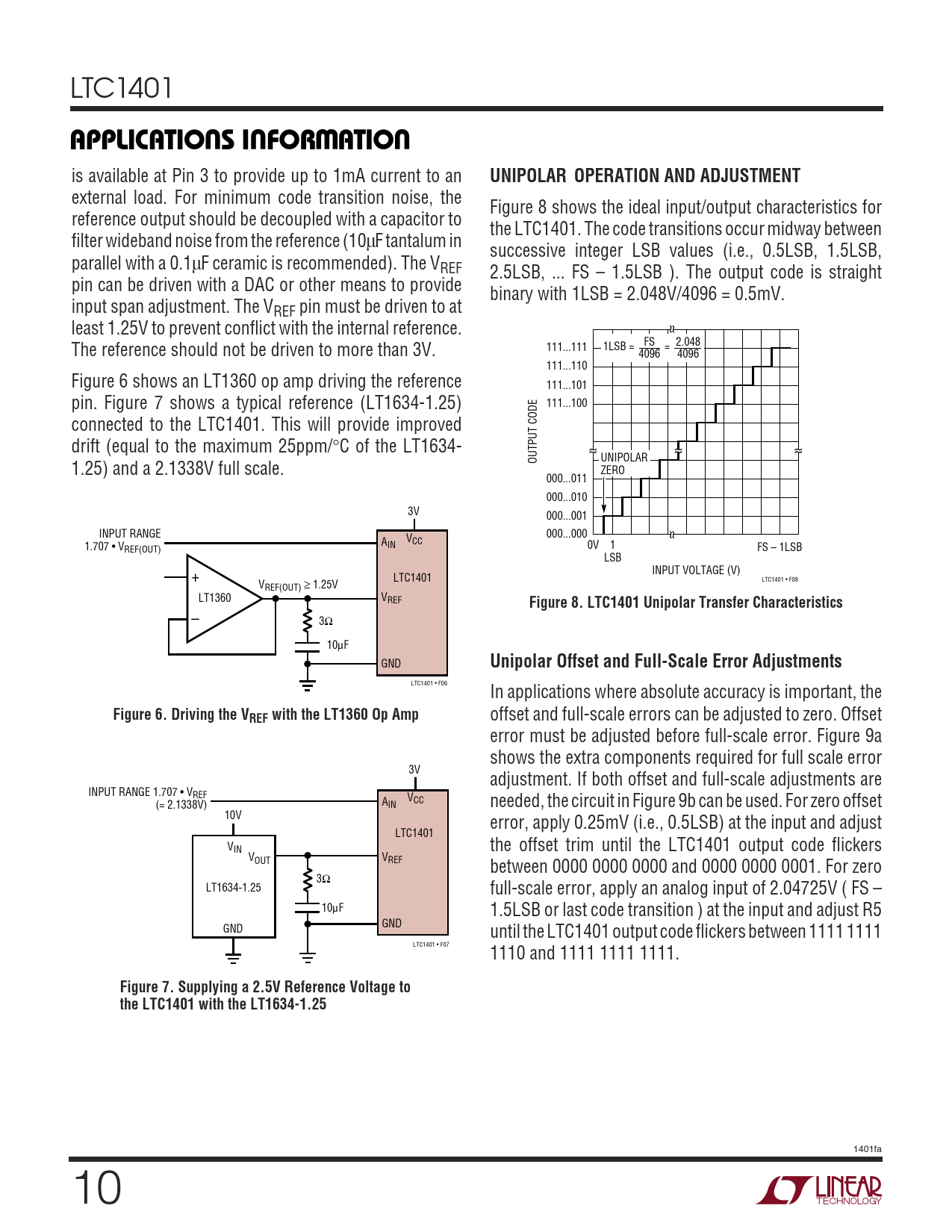 LTC1401 UUWUAPPLICATIONS INFORMATION is available at Pin 3 to provide up to 1mA current to an UNIPOLAR OPERATION AND ADJUSTMENT external load. For minimum code transition noise, the Figure 8 shows the ideal input/output characteristics for reference output should be decoupled with a capacitor to the LTC1401. The code transitions occur midway between filter wideband noise from the reference (10µF tantalum in successive integer LSB values (i.e., 0.5LSB, 1.5LSB, parallel with a 0.1µF ceramic is recommended). The VREF 2.5LSB, ... FS – 1.5LSB ). The output code is straight pin can be driven with a DAC or other means to provide binary with 1LSB = 2.048V/4096 = 0.5mV. input span adjustment. The VREF pin must be driven to at least 1.25V to prevent conflict with the internal reference. The reference should not be driven to more than 3V. 2.048 111...111 1LSB = FS = 4096 4096 111...110 Figure 6 shows an LT1360 op amp driving the reference 111...101 pin. Figure 7 shows a typical reference (LT1634-1.25) 111...100 connected to the LTC1401. This will provide improved drift (equal to the maximum 25ppm/°C of the LT1634- OUTPUT CODE UNIPOLAR 1.25) and a 2.1338V full scale. ZERO 000...011 000...010 3V 000...001 INPUT RANGE 000...000 A V IN CC 1.707 • VREF(OUT) 0V 1 FS – 1LSB LSB + INPUT VOLTAGE (V) LTC1401 LTC1401 • F08 VREF(OUT) ≥ 1.25V LT1360 VREF Figure 8. LTC1401 Unipolar Transfer Characteristics – 3Ω 10µF GND Unipolar Offset and Full-Scale Error Adjustments LTC1401 • F06 In applications where absolute accuracy is important, the Figure 6. Driving the VREF with the LT1360 Op Amp offset and full-scale errors can be adjusted to zero. Offset error must be adjusted before full-scale error. Figure 9a shows the extra components required for full scale error 3V adjustment. If both offset and full-scale adjustments are INPUT RANGE 1.707 • VREF V (= 2.1338V) AIN CC needed, the circuit in Figure 9b can be used. For zero offset 10V error, apply 0.25mV (i.e., 0.5LSB) at the input and adjust LTC1401 V the offset trim until the LTC1401 output code flickers IN VOUT VREF between 0000 0000 0000 and 0000 0000 0001. For zero 3Ω LT1634-1.25 full-scale error, apply an analog input of 2.04725V ( FS – 10µF 1.5LSB or last code transition ) at the input and adjust R5 GND GND until the LTC1401 output code flickers between 1111 1111 LTC1401 • F07 1110 and 1111 1111 1111. Figure 7. Supplying a 2.5V Reference Voltage to the LTC1401 with the LT1634-1.25 1401fa 10