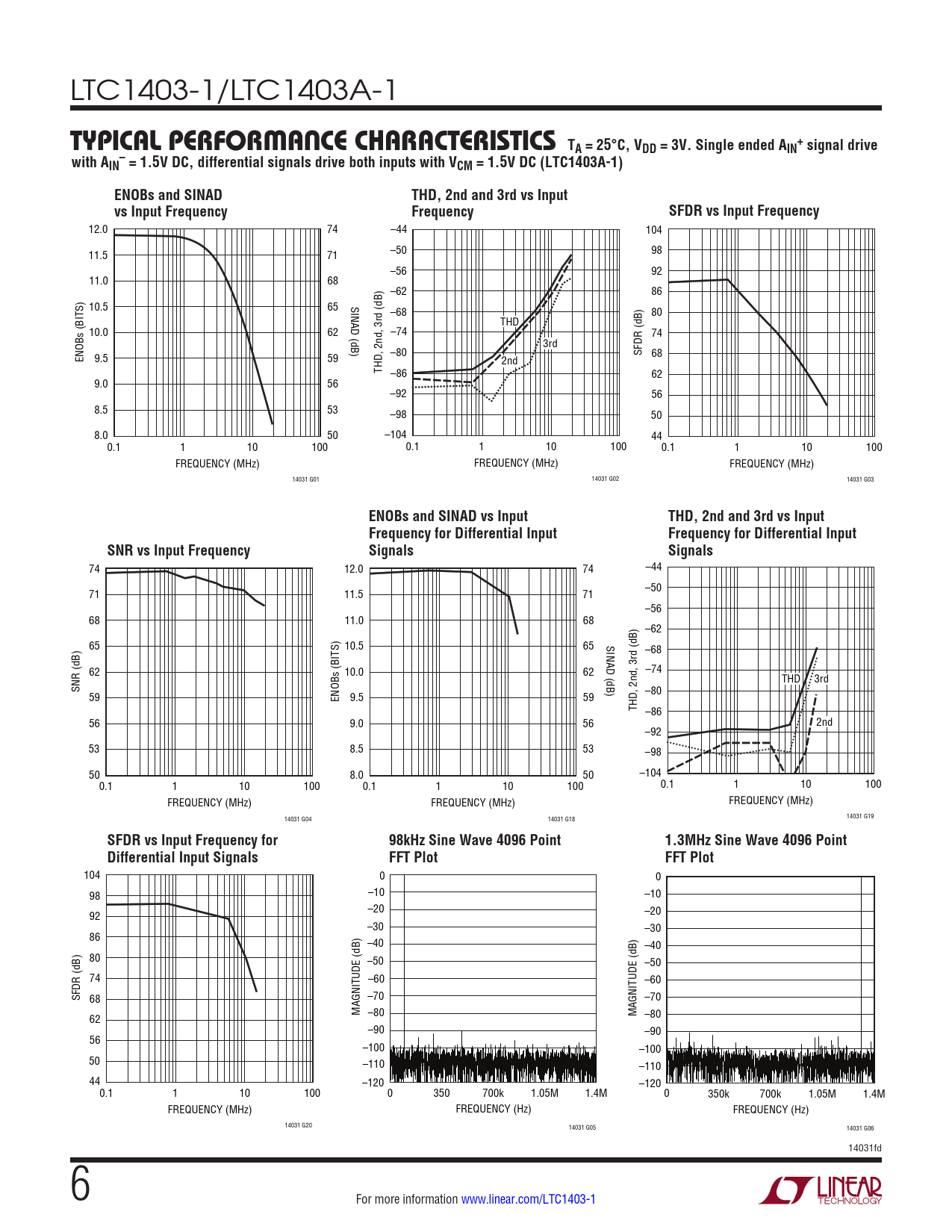 TYPICAL PERFORMANCE CHARACTERISTICS T + A = 25°C, VDD = 3V. Single ended AIN signal drive with A – IN = 1.5V DC, differential signals drive both inputs with VCM = 1.5V DC (LTC1403A-1) ENOBs and SINAD THD, 2nd and 3rd vs Input vs Input Frequency Frequency SFDR vs Input Frequency