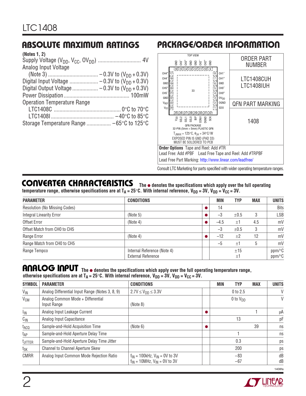 TOP VIEW Supply Voltage (V – + – + ORDER PART DD, VCC, OVDD) .. 4V Analog Input Voltage GND CH3 CH3 GND GND CH2 CH2 GND NUMBER 16 15 14 13 12 11 10 9 (Note 3) ... – 0.3V to (V CH4+ 17 8 CH1– DD + 0.3V) CH4– 18 7 CH1+ Digital Input Voltage .. – 0.3V to (V LTC1408CUH DD + 0.3V) GND 19 6 GND Digital Output Voltage .. – 0.3V to (V LTC1408IUH DD + 0.3V) CH5+ 20 5 CH0– 33 Power Dissipation .. 100mW CH5– 21 4 CH0+ GND 22 3 OVDD Operation Temperature Range V 23 2 REF OGND QFN PART MARKING LTC1408C ... 0°C to 70°C V 24 1 CC SDO 25 26 27 28 29 30 31 32 LTC1408I .. – 40°C to 85°C DDV BIP SCK Storage Temperature Range ... – 65°C to 125°C SEL2 SEL1 SEL0 CONV DGND 1408 QFN PACKAGE 32-PIN (5mm × 5mm) PLASTIC QFN TJMAX = 125°C, θJA = 34°C/ W EXPOSED PIN IS GND (PAD 33) MUST BE SOLDERED TO PCB