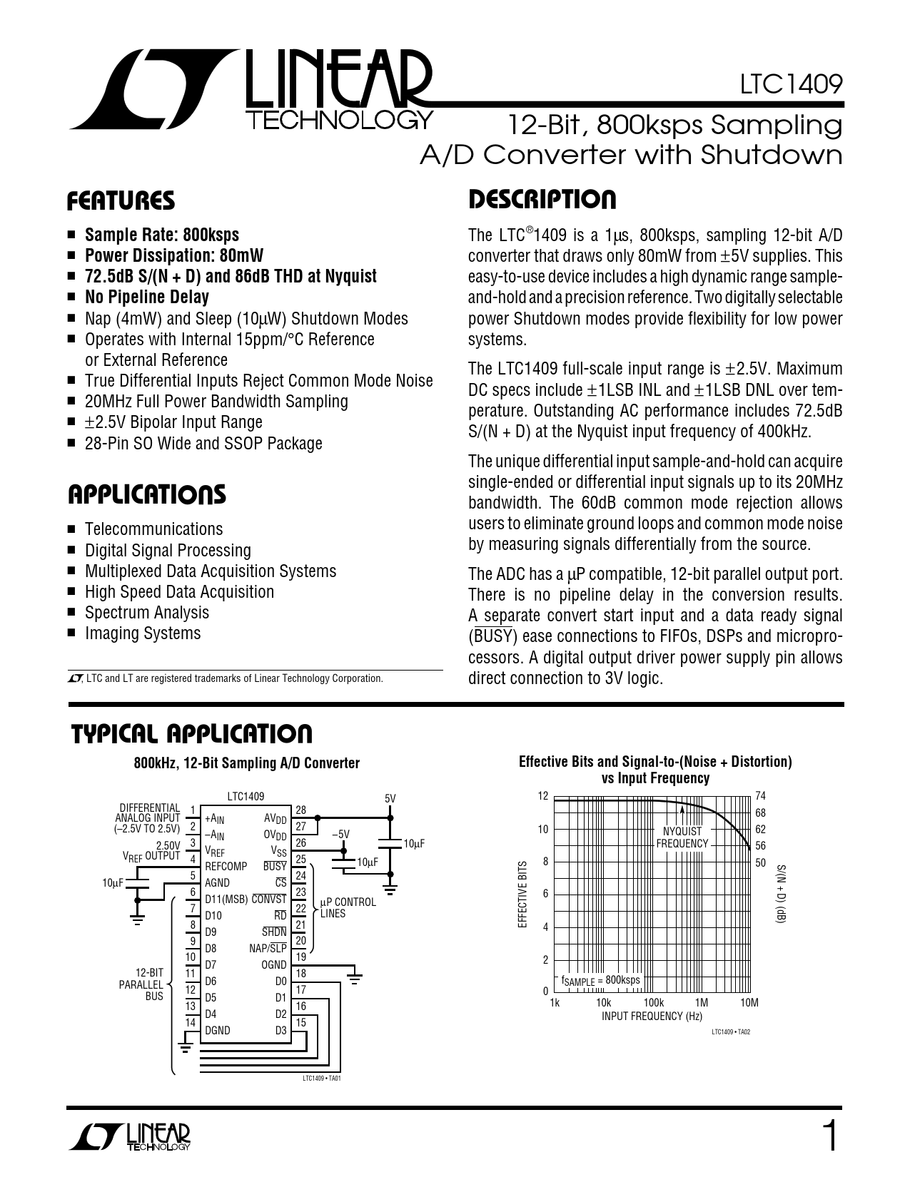LTC1409 12-Bit, 800ksps Sampling A/D Converter with Shutdown UFEATUSREDESCRIPTIO ■ Sample Rate: 800ksps The LTC®1409 is a 1µs, 800ksps, sampling 12-bit A/D ■ Power Dissipation: 80mW converter that draws only 80mW from ±5V supplies. This ■ 72.5dB S/(N + D) and 86dB THD at Nyquist easy-to-use device includes a high dynamic range sample- ■ No Pipeline Delay and-hold and a precision reference. Two digitally selectable ■ Nap (4mW) and Sleep (10µW) Shutdown Modes power Shutdown modes provide flexibility for low power ■ Operates with Internal 15ppm/°C Reference systems. or External Reference The LTC1409 full-scale input range is ±2.5V. Maximum ■ True Differential Inputs Reject Common Mode Noise DC specs include ±1LSB INL and ±1LSB DNL over tem- ■ 20MHz Full Power Bandwidth Sampling perature. Outstanding AC performance includes 72.5dB ■ ±2.5V Bipolar Input Range S/(N + D) at the Nyquist input frequency of 400kHz. ■ 28-Pin SO Wide and SSOP Package The unique differential input sample-and-hold can acquire OU single-ended or differential input signals up to its 20MHz APPLICATIS bandwidth. The 60dB common mode rejection allows ■ users to eliminate ground loops and common mode noise Telecommunications ■ by measuring signals differentially from the source. Digital Signal Processing ■ Multiplexed Data Acquisition Systems The ADC has a µP compatible, 12-bit parallel output port. ■ High Speed Data Acquisition There is no pipeline delay in the conversion results. ■ Spectrum Analysis A separate convert start input and a data ready signal ■ Imaging Systems (BUSY) ease connections to FIFOs, DSPs and micropro- cessors. A digital output driver power supply pin allows , LTC and LT are registered trademarks of Linear Technology Corporation. direct connection to 3V logic. OUTYPICAL APPLICATI800kHz, 12-Bit Sampling A/D ConverterEffective Bits and Signal-to-(Noise + Distortion)vs Input Frequency LTC1409 5V 12 74 DIFFERENTIAL 1 28 68 ANALOG INPUT +AIN AVDD 2 27 (–2.5V TO 2.5V) 10 –A 62 NYQUIST IN OVDD –5V 3 26 2.50V 10µF FREQUENCY V 56 REF VSS VREF OUTPUT 4 25 8 50 S/(N + D) (dB) REFCOMP BUSY 10µF 5 24 10µF AGND CS 6 23 6 D11(MSB) CONVST µP CONTROL 7 22 D10 RD LINES 8 21 EFFECTIVE BITS 4 D9 SHDN 9 20 D8 NAP/SLP 10 19 2 D7 OGND 12-BIT 11 18 D6 D0 f PARALLEL SAMPLE = 800ksps 12 17 0 BUS D5 D1 13 16 1k 10k 100k 1M 10M D4 D2 INPUT FREQUENCY (Hz) 14 15 DGND D3 LTC1409 • TA02 LTC1409 • TA01 1