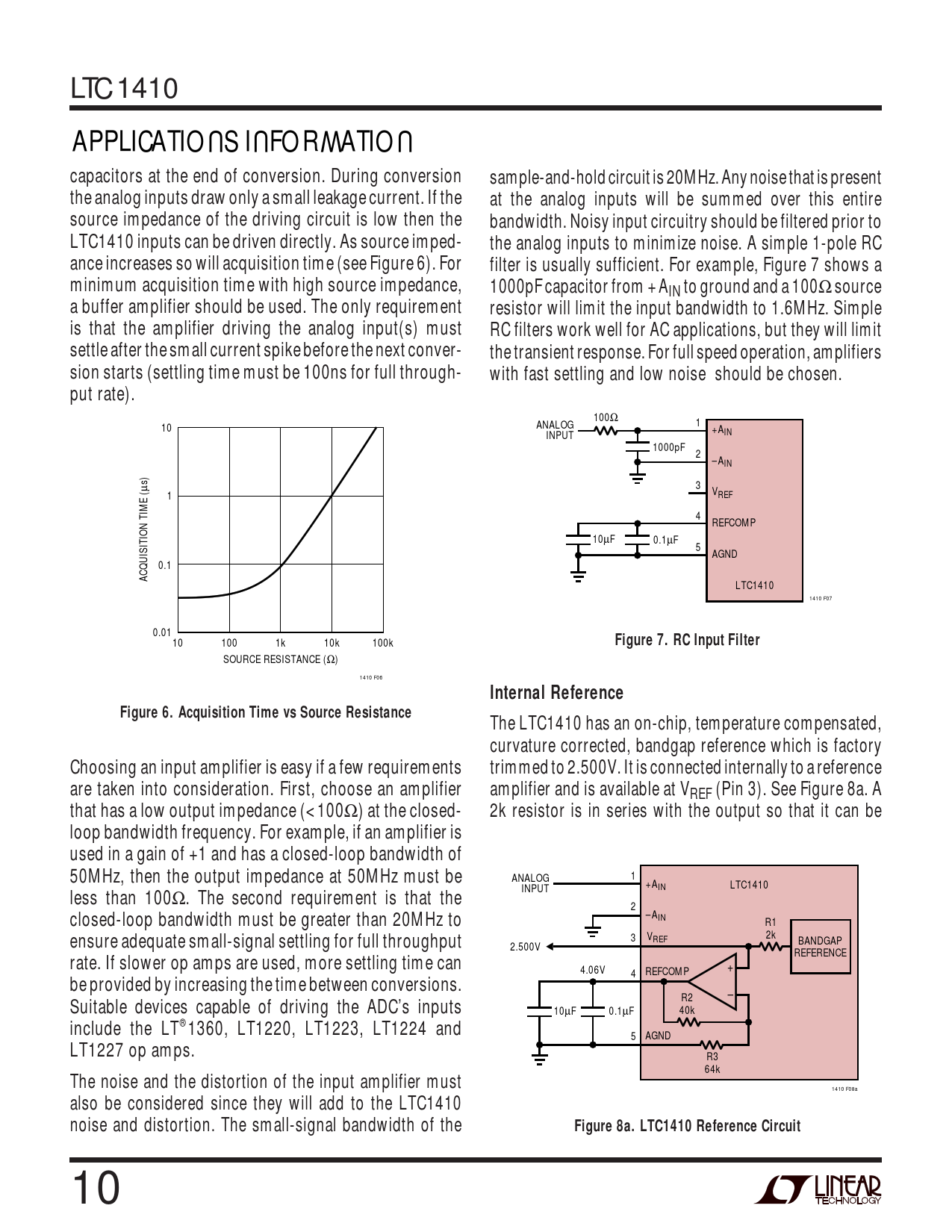 APPLICATIONS INFORMATION. Figure 7. RC Input Filter. Internal Reference. Figure 6. Acquisition Time vs Source Resistance